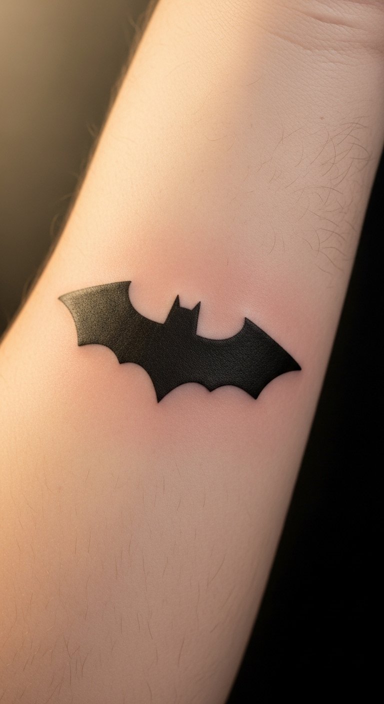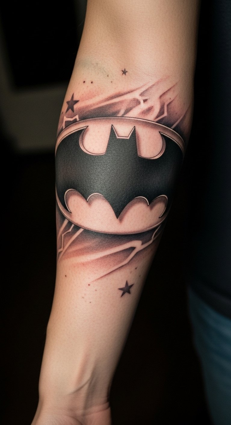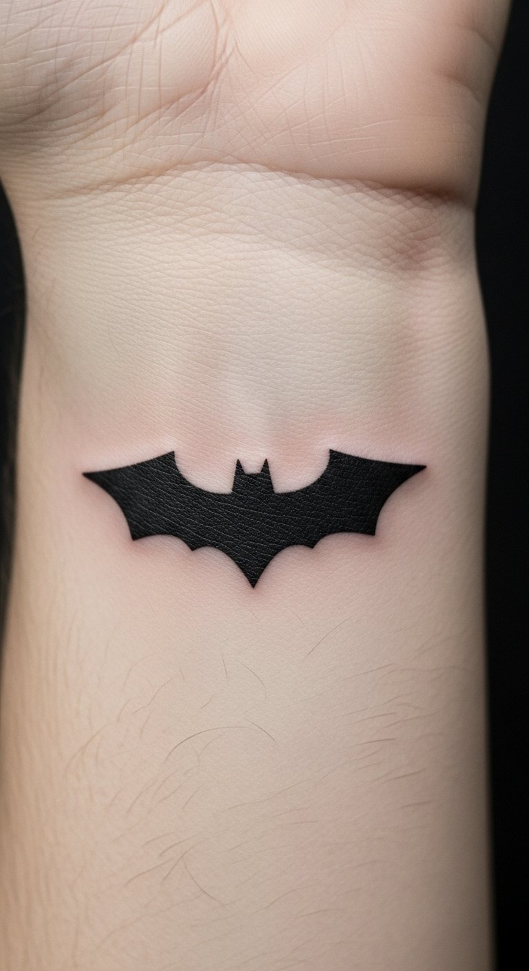 Positioned on the forearm, it symbolizes strength and resilience, allowing the wearer to express their admiration for the Dark Knight in a subtle yet powerful way.