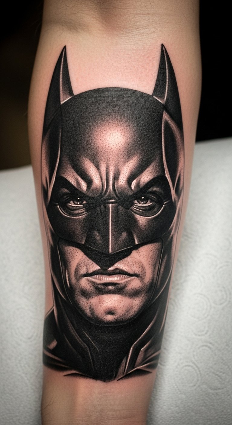 The realistic artistry evokes deep emotions, symbolizing the wearer’s admiration for Batman’s unwavering dedication to protecting the vulnerable, while also showcasing the intricate beauty of tattoo craftsmanship.