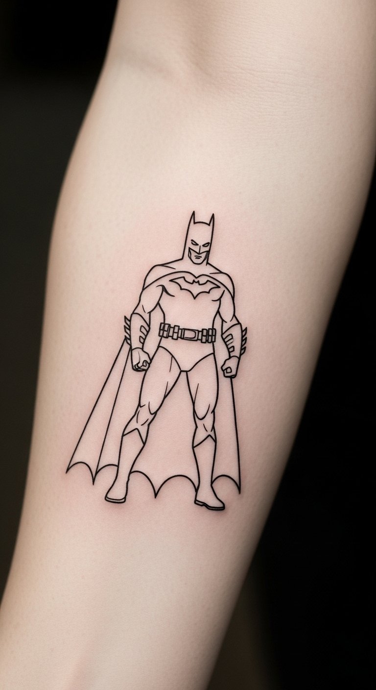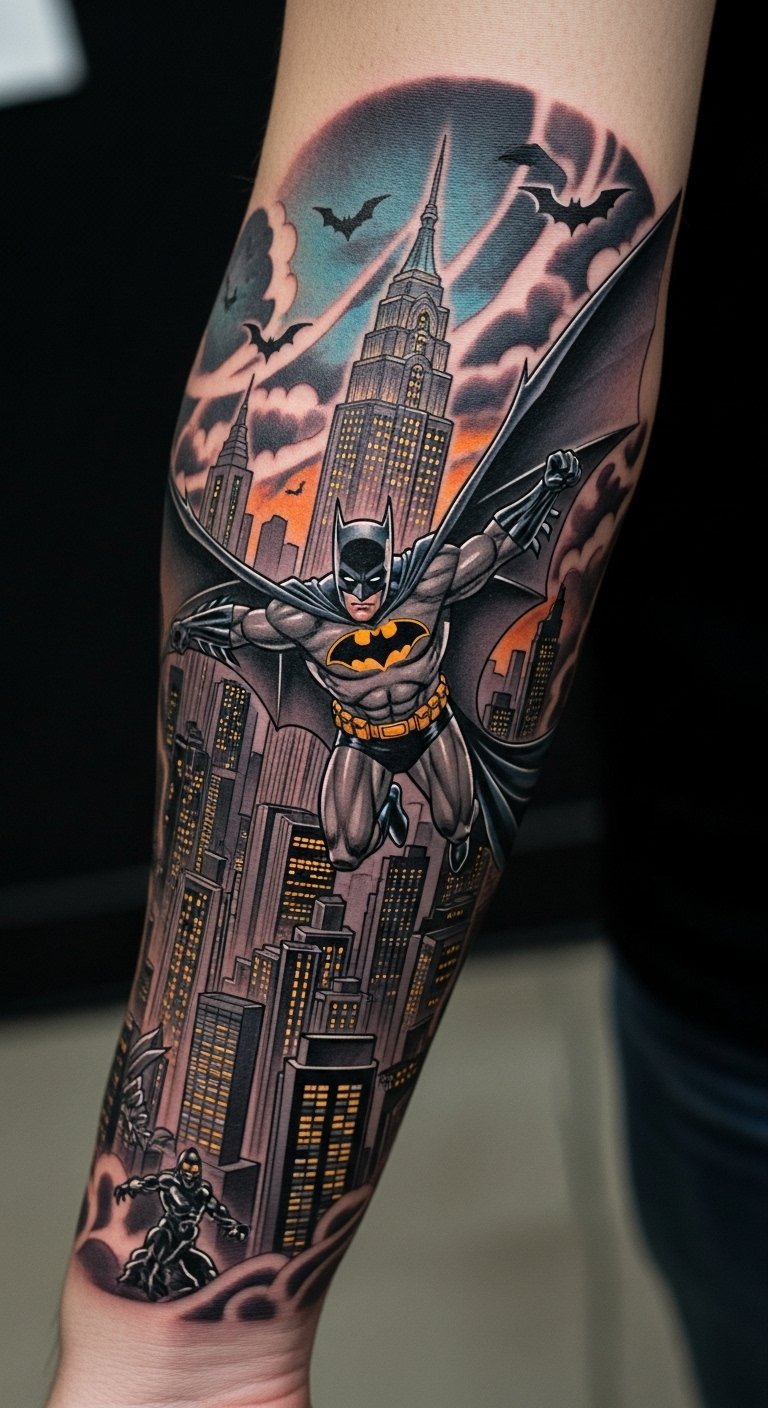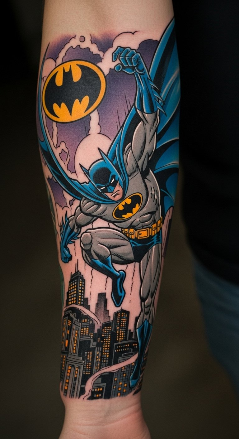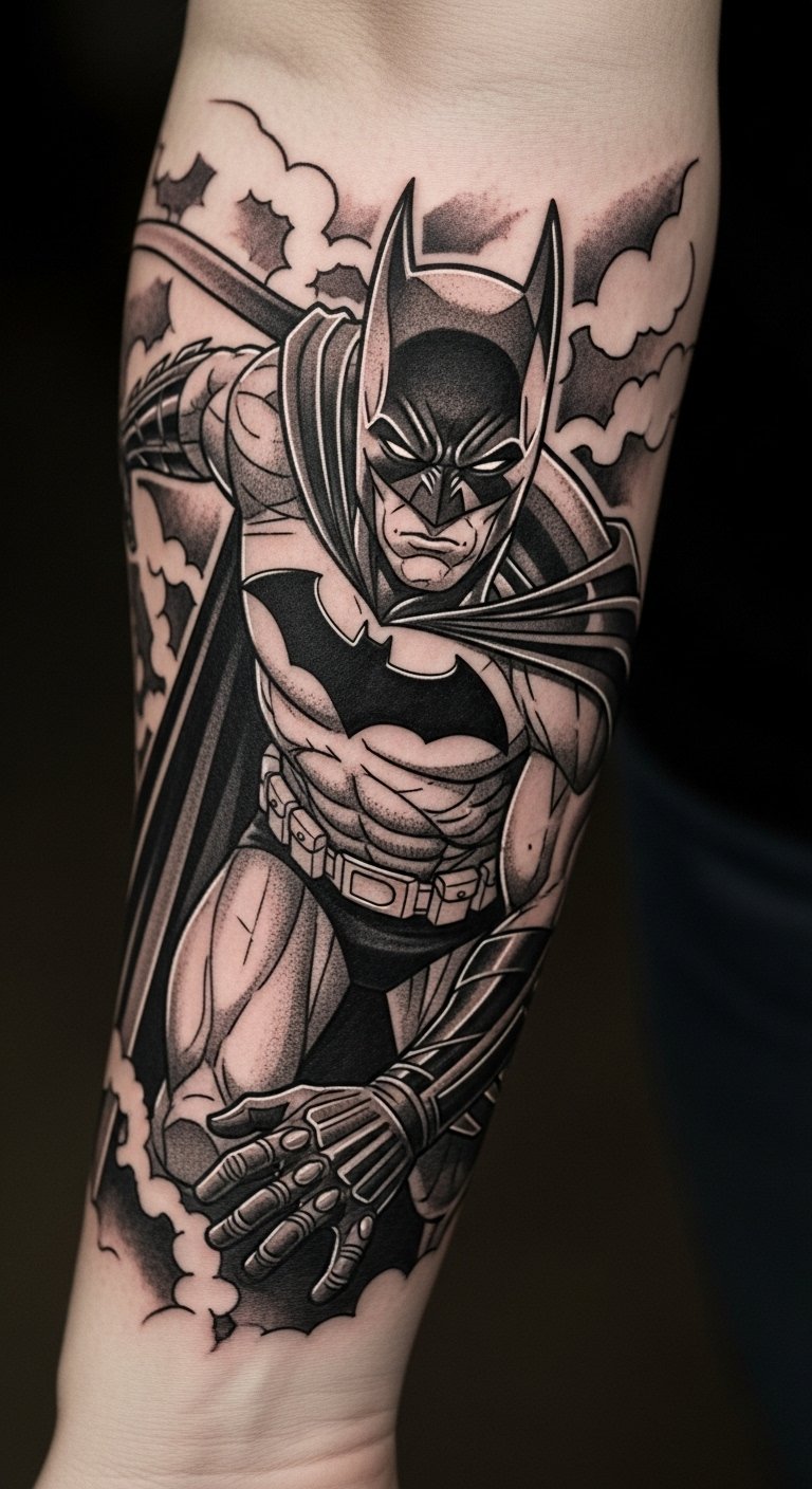 The intricate details and dynamic composition transform the arm into a canvas that not only honors Batman’s legacy but also reflects the wearer’s personal journey, evoking emotions of bravery and hope.