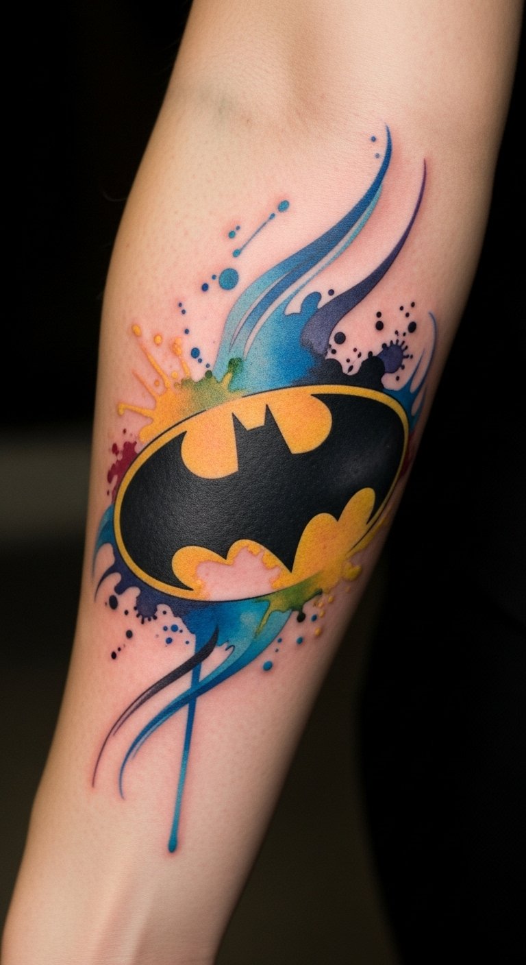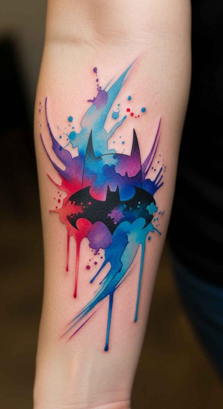 This stunning watercolor Batman tattoo, placed on the forearm, symbolizes the wearer’s inner hero and the freedom of self-expression through art.