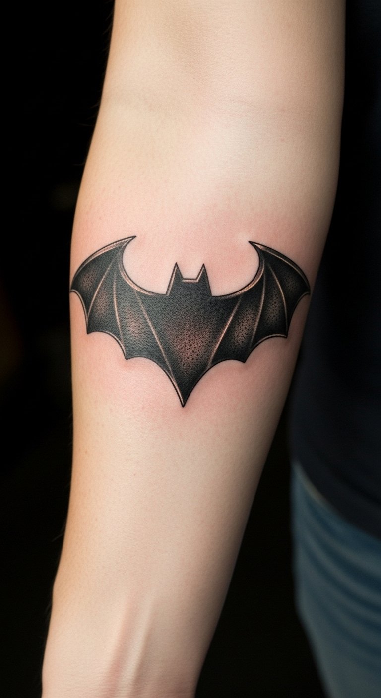This tattoo of the Bat symbol on the forearm serves as a powerful emblem of justice and vigilance.