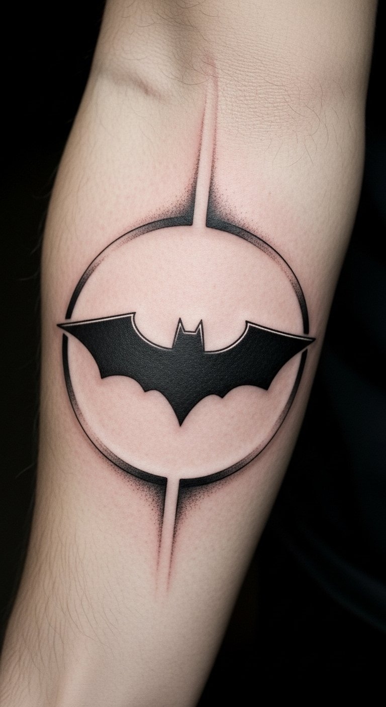 This Bat-Signal tattoo serves as a powerful emblem of hope and vigilance, perfectly placed on the forearm for visibility and personal expression.