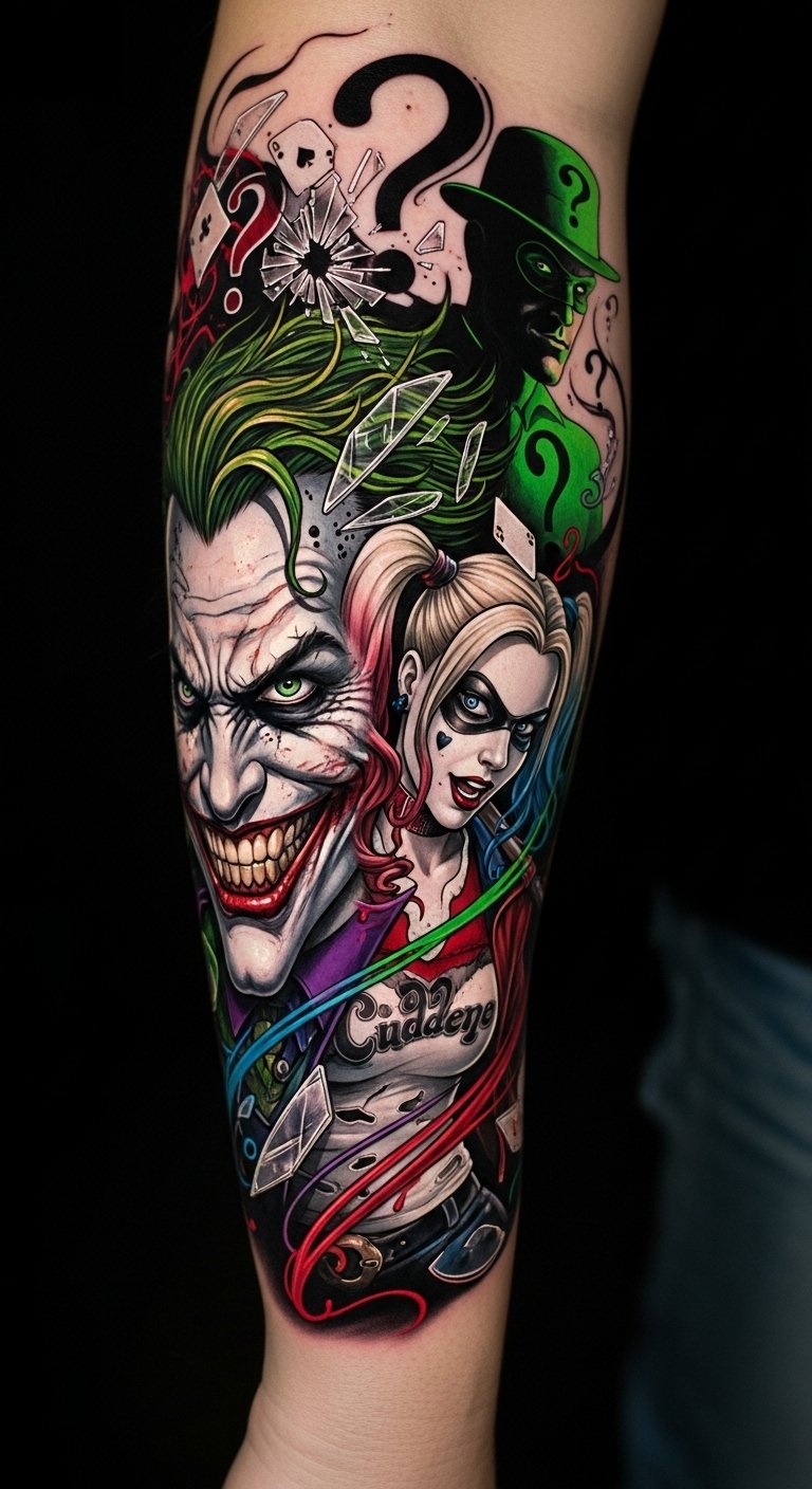 This tattoo, placed on the forearm, serves as a striking visual narrative that embodies the complex interplay of Gotham’s most notorious villains.