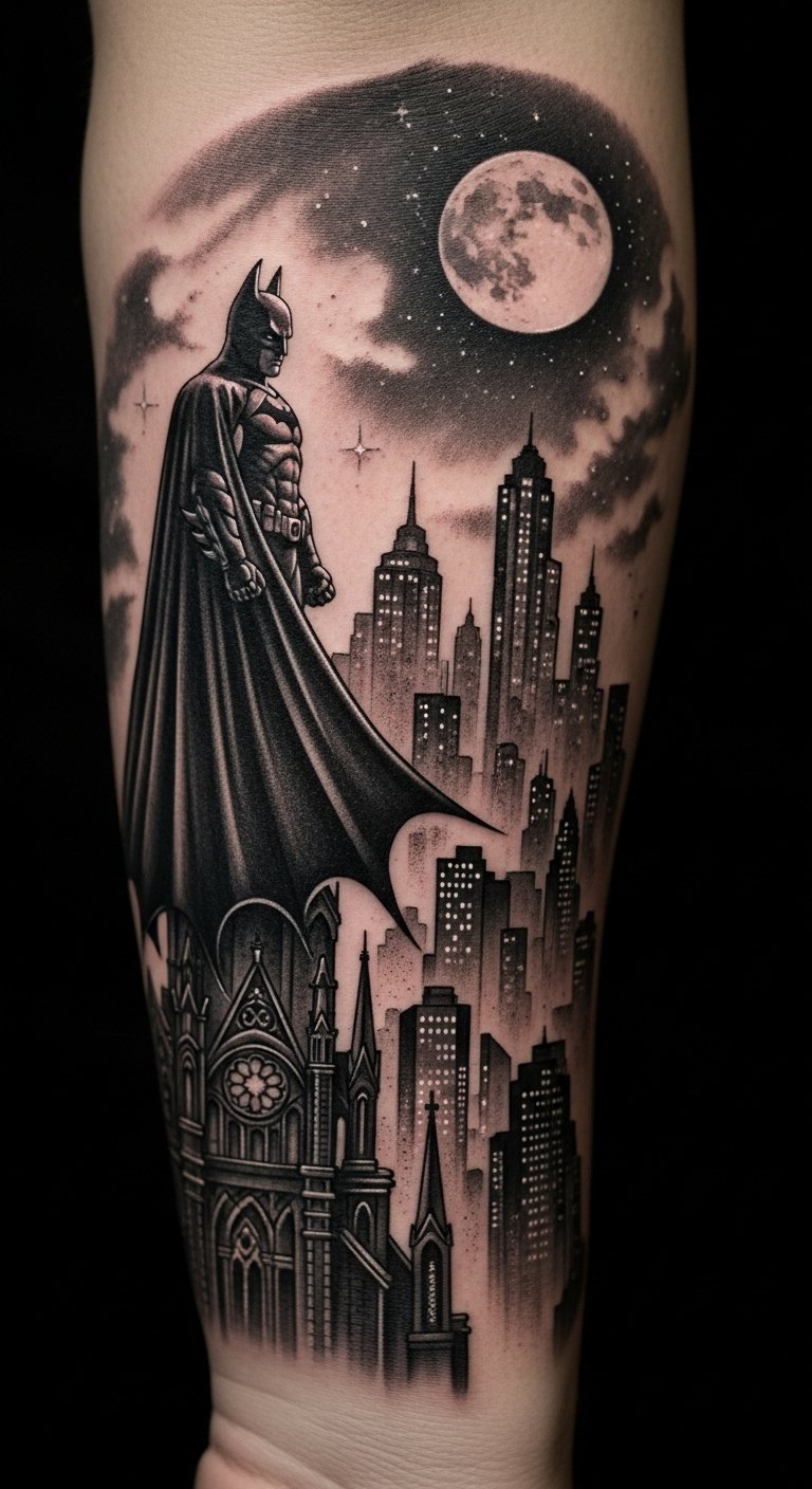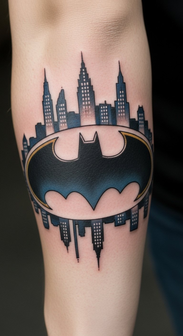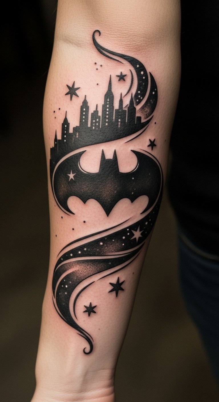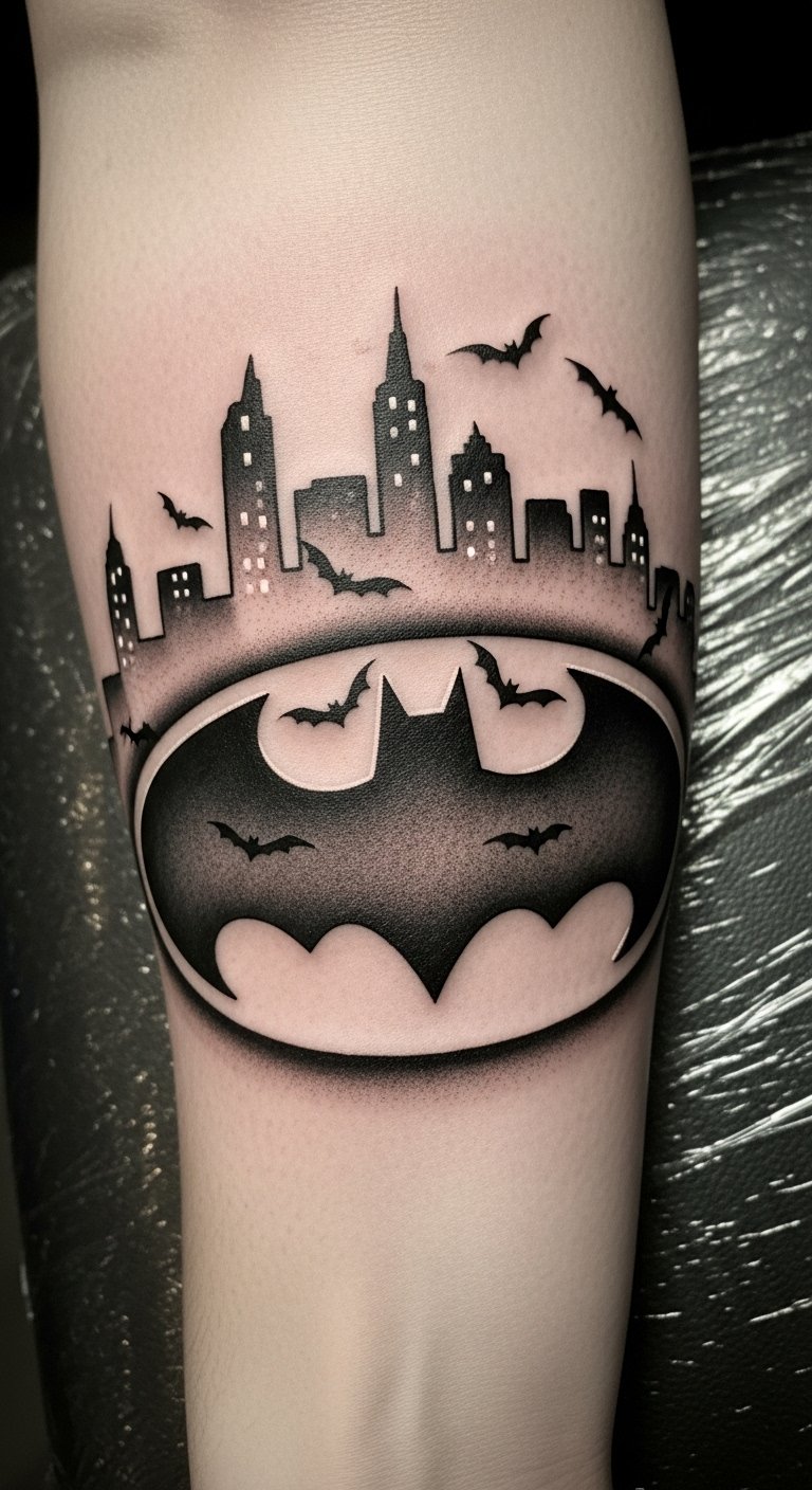 The placement on the forearm allows for visibility, making it a bold statement of admiration for the hero. With the skyline of Gotham subtly included, it connects the wearer to the lore of Batman, serving as a daily reminder to uphold courage and integrity in the face of adversity.