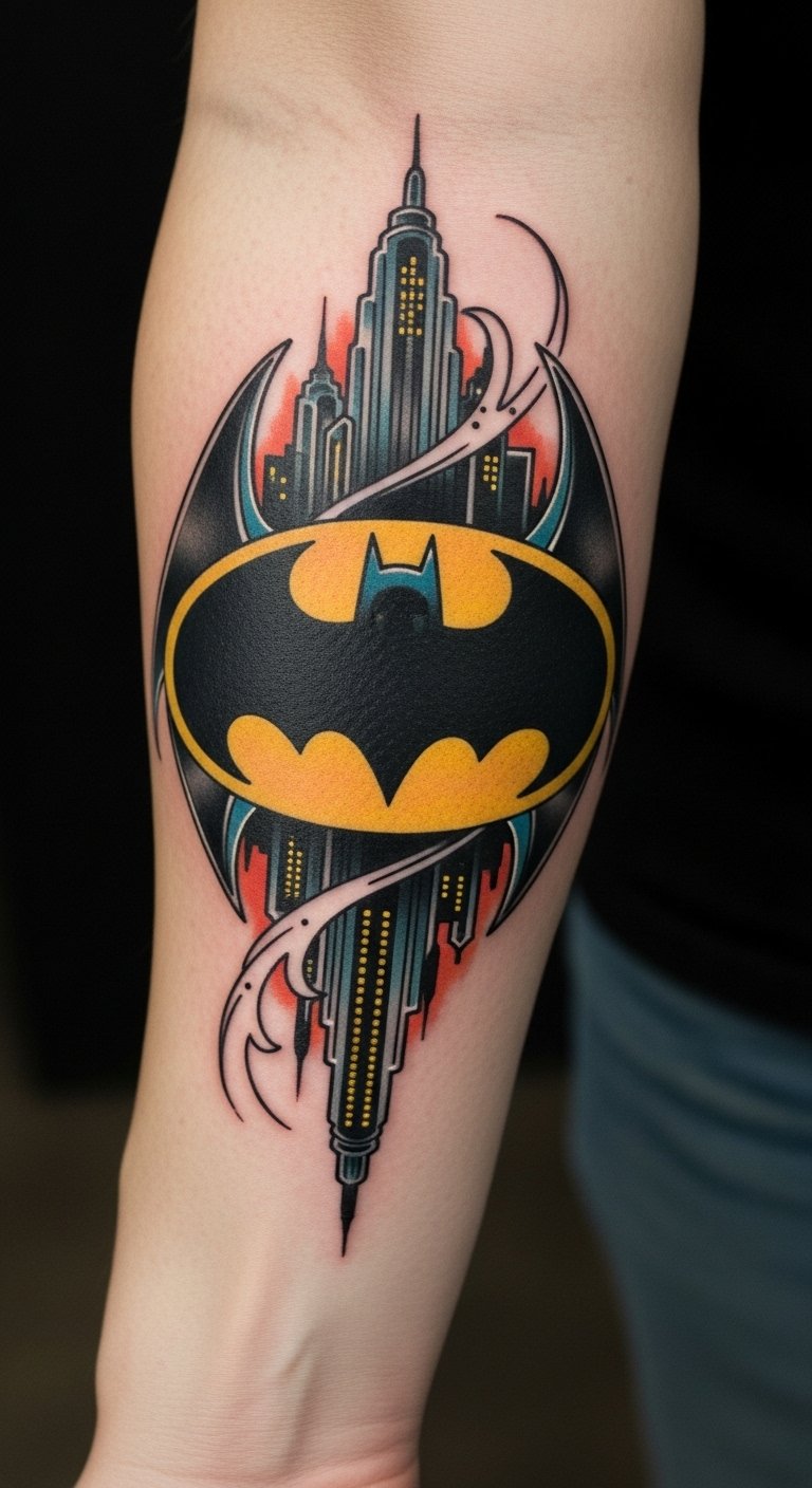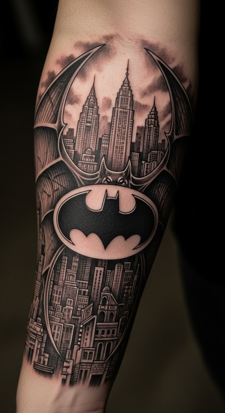 Placed on the forearm, it serves as a constant reminder of one’s inner strength and commitment to justice. The surrounding elements of wings and skyline not only enhance the visual appeal but also represent the duality of the character—both protector and vigilante.
