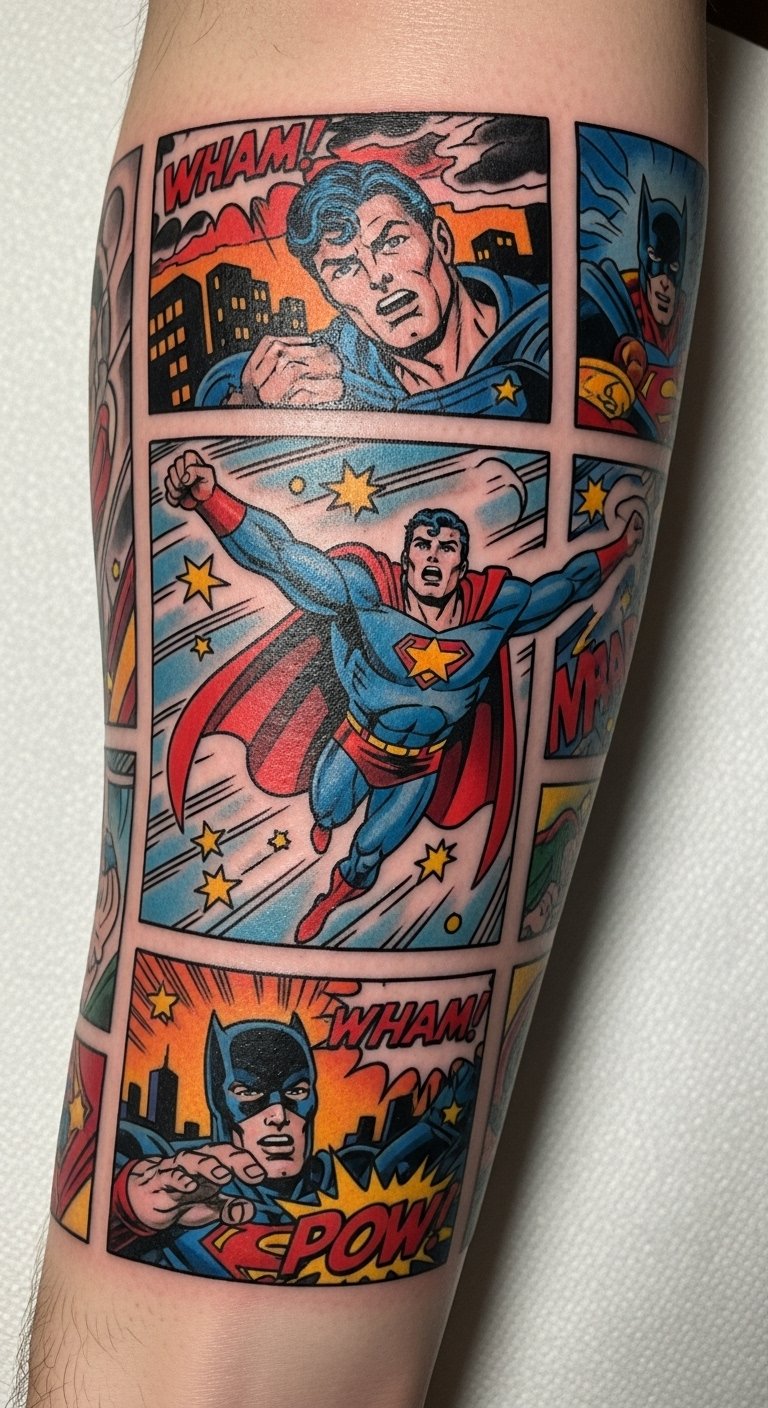 This tattoo embodies the spirit of comic storytelling, transforming the forearm into a canvas of adventure and excitement.