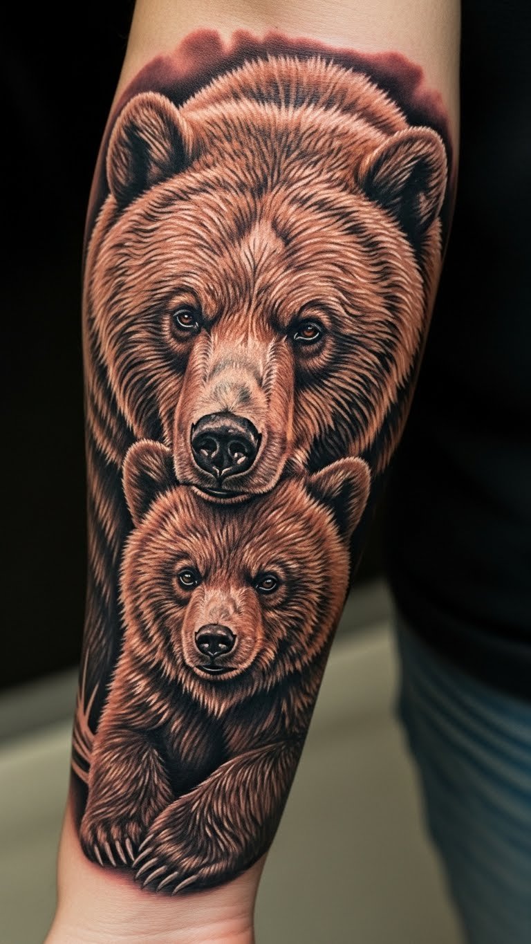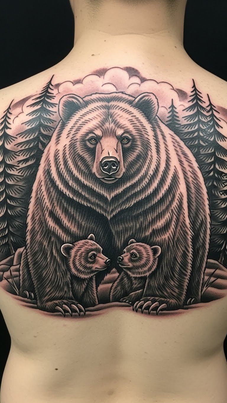 This tattoo symbolizes courage and resilience, embodying the fierce guardianship of a mother bear.