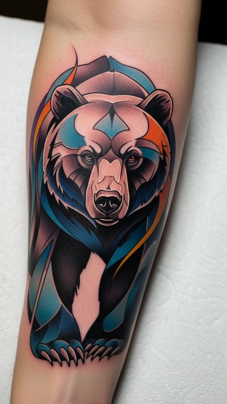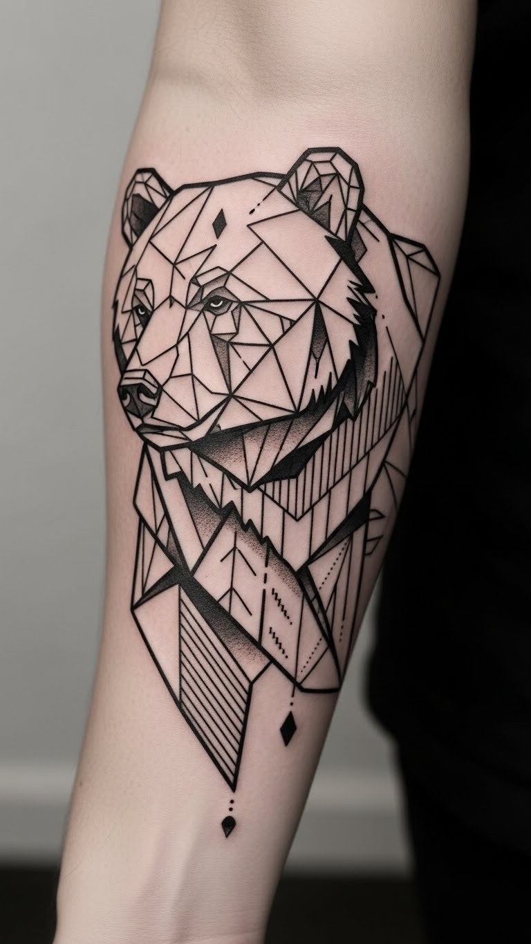 This abstract bear tattoo symbolizes strength and independence, reflecting the wearer’s personal journey and connection to nature.