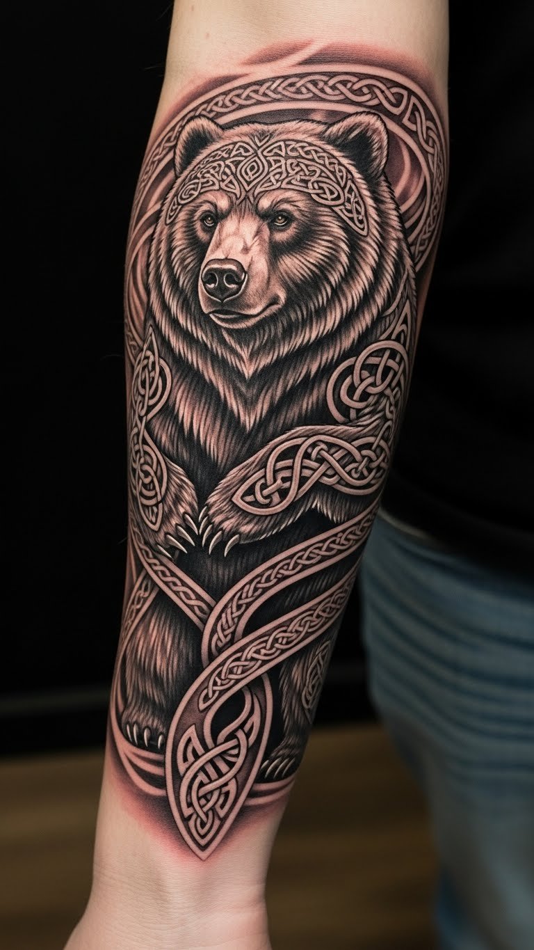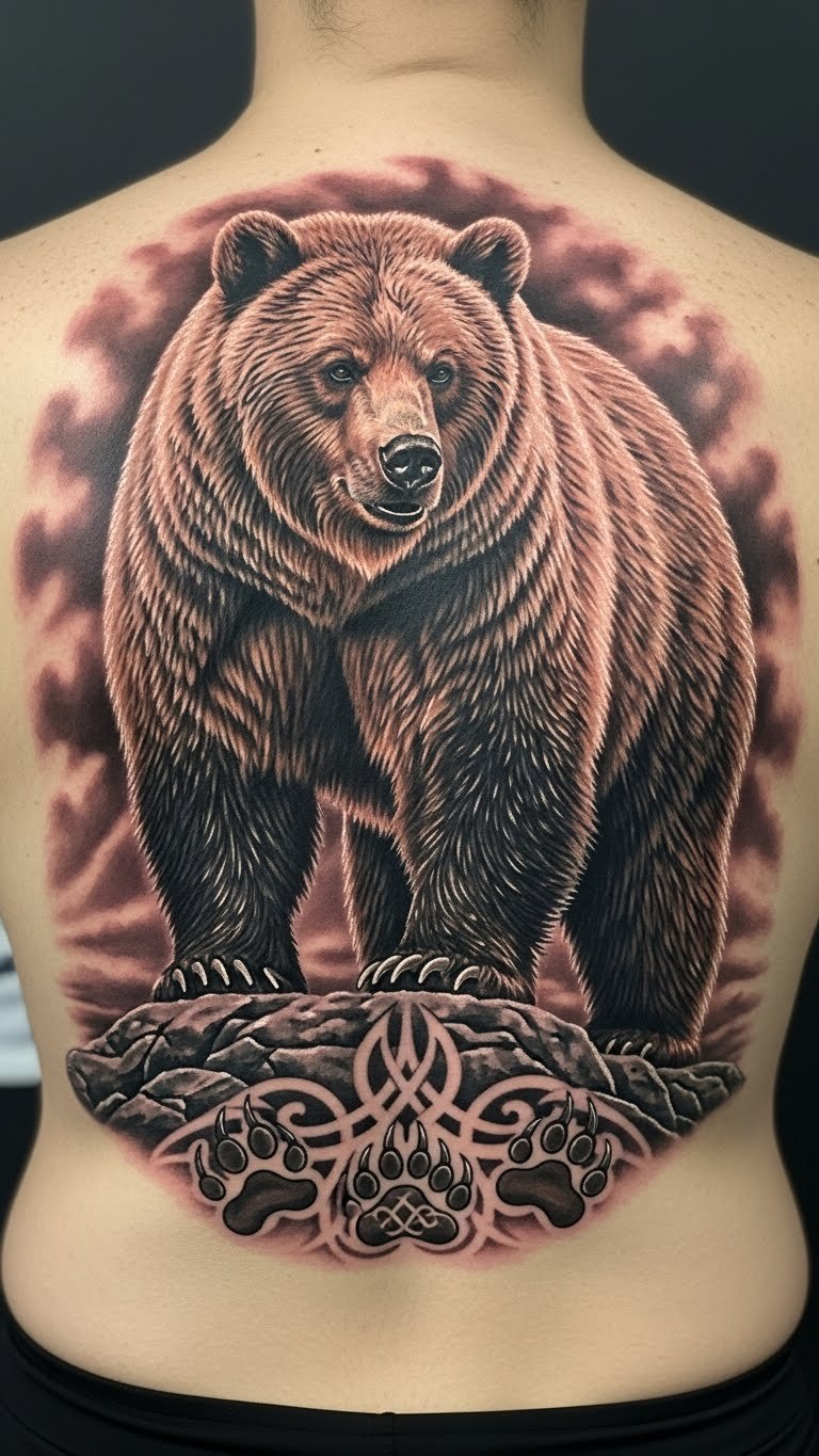 This tattoo symbolizes strength, courage, and a deep connection to ancient bear legends, reflecting the wearer’s appreciation for both nature and heritage.