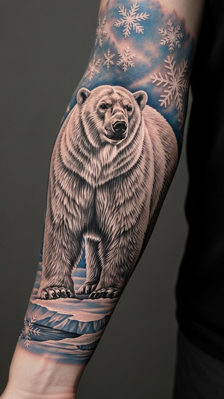 The polar bear tattoo symbolizes strength, resilience, and the urgent need for conservation.