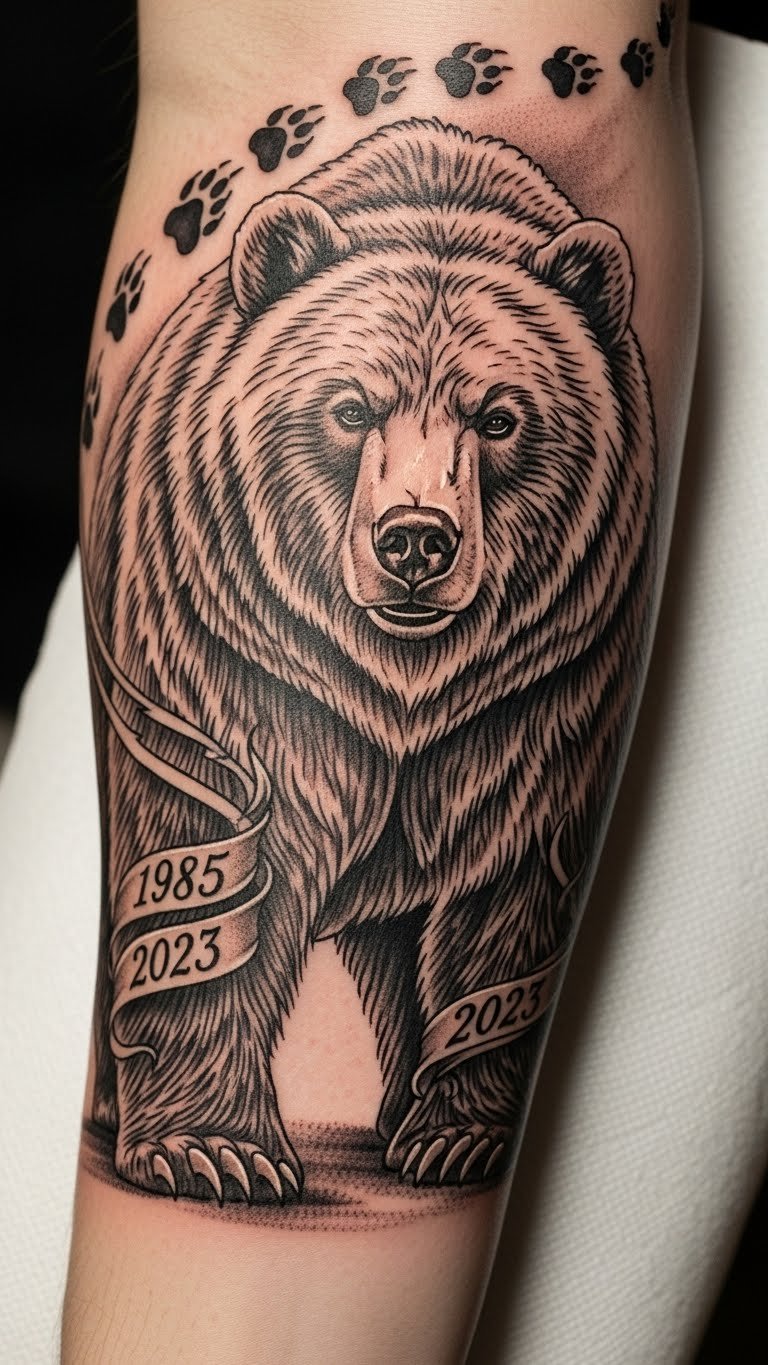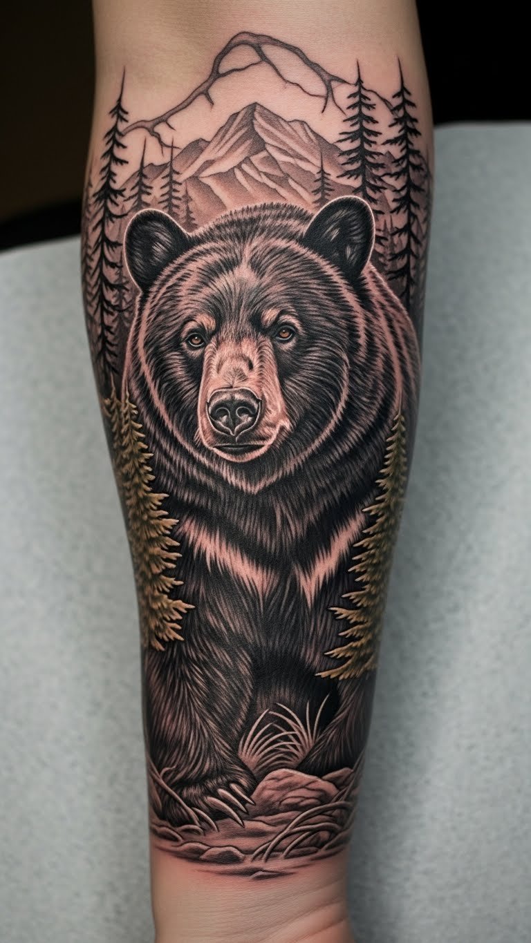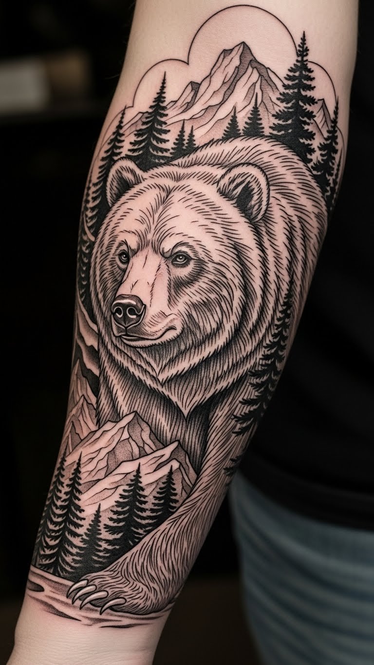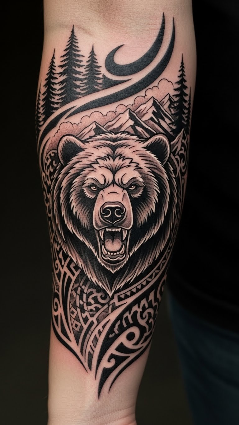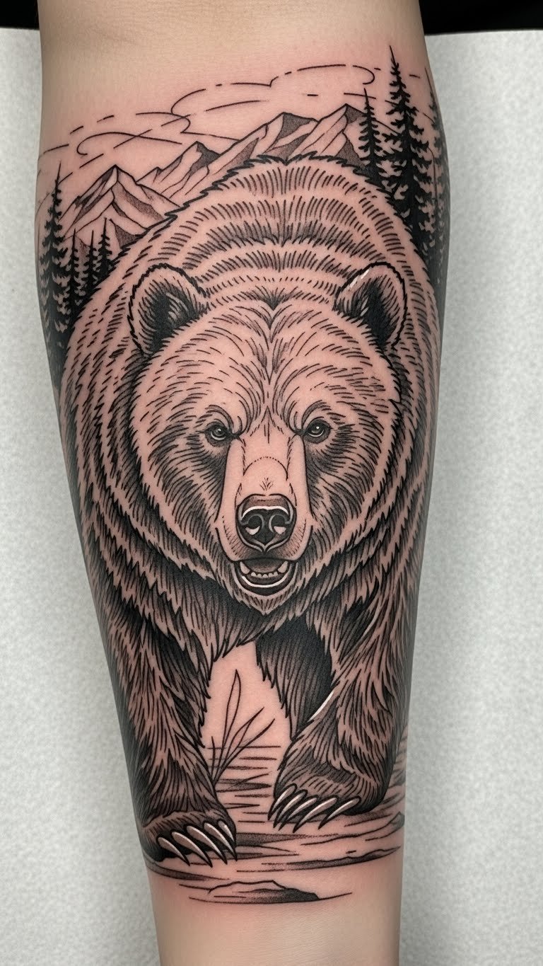 This tattoo design captures the essence of bear guardianship and resilience, symbolizing a strong connection to nature.