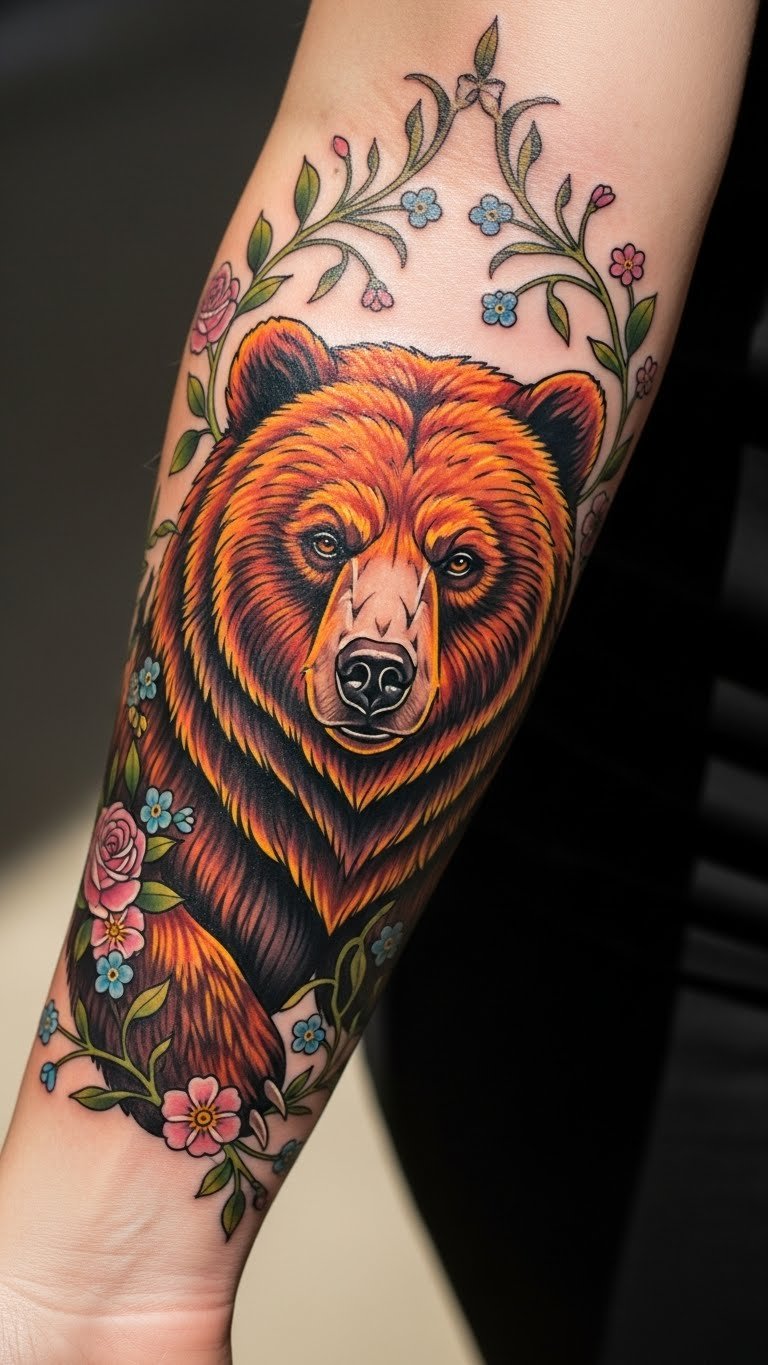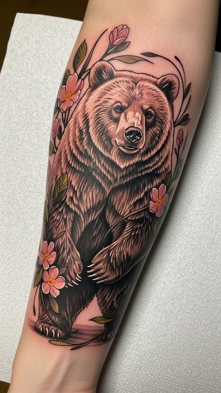 This bear tattoo symbolizes strength and courage, embodying the spirit of resilience and protection. The floral elements surrounding the bear add a touch of beauty and balance, representing growth and harmony. Placed on the forearm, it serves as a constant reminder of one’s inner strength and the journey through challenges, visible to inspire both the wearer and those around them. The choice of this location allows for personal expression while remaining easily accessible for admiration.