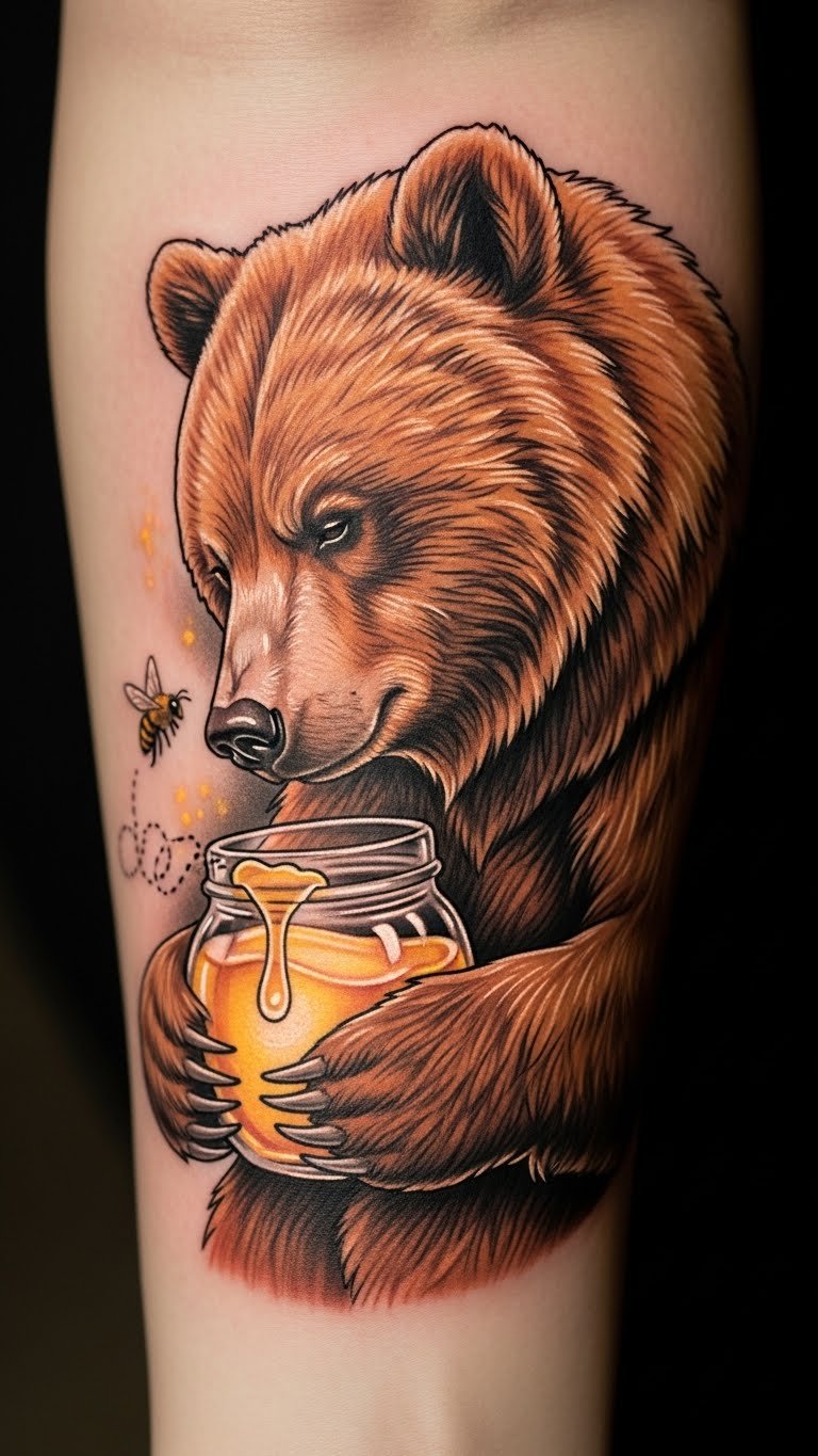 This tattoo symbolizes the nurturing strength of a mother figure, represented by the mama bear, and the sweetness of life embodied by the honey jar.