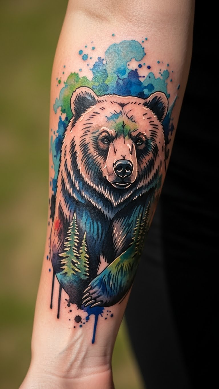 This bear tattoo on the forearm serves as a profound symbol of wild spirit and adventure, perfectly reflecting the wearer’s love for nature and exploration.