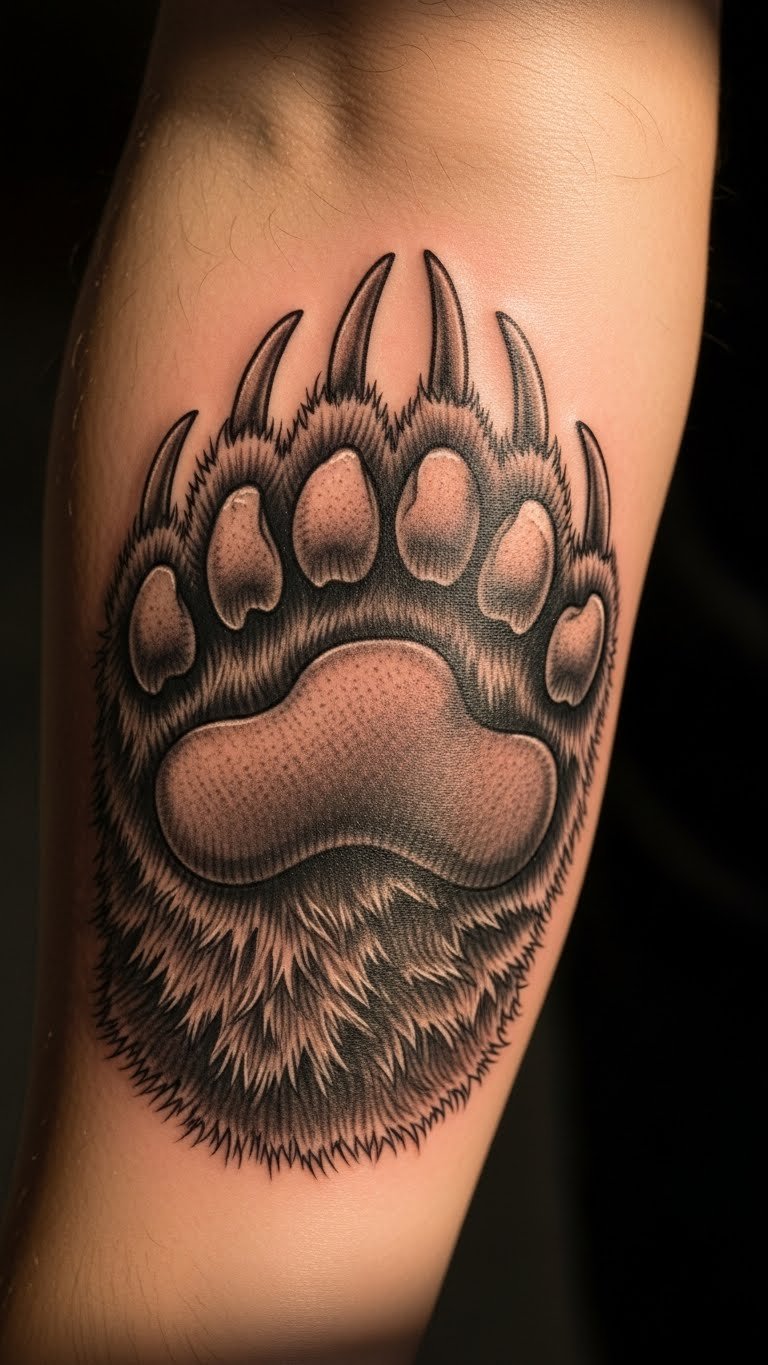 This bear paw print tattoo symbolizes a powerful connection to the wilderness, embodying strength and resilience.