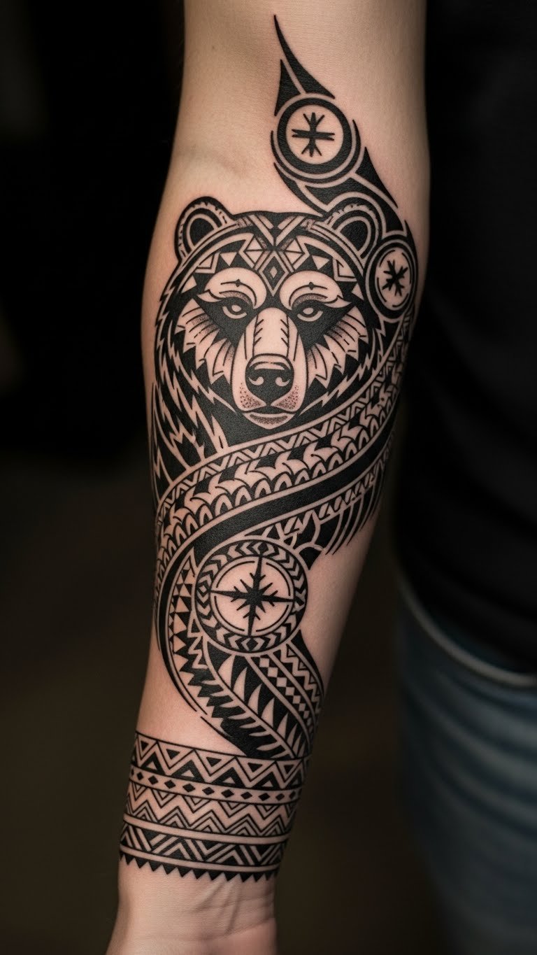 This tribal bear tattoo symbolizes strength, resilience, and a deep connection to heritage.