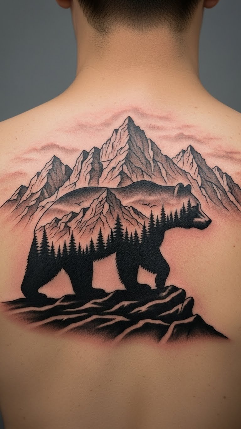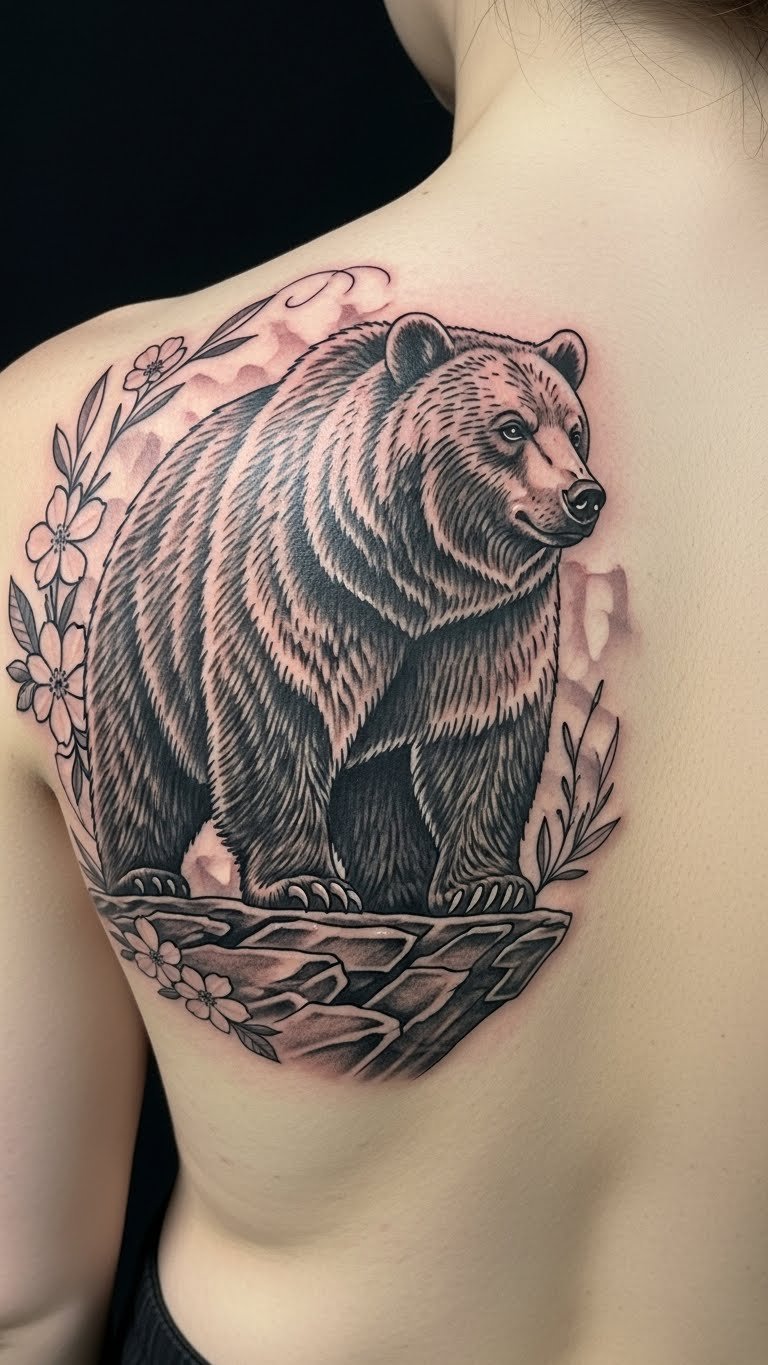 The placement on the upper back allows for a powerful statement, representing strength not only physically but also emotionally. The bear’s protective nature resonates with the wearer’s own journey, inspiring a deep connection to family and the wild.