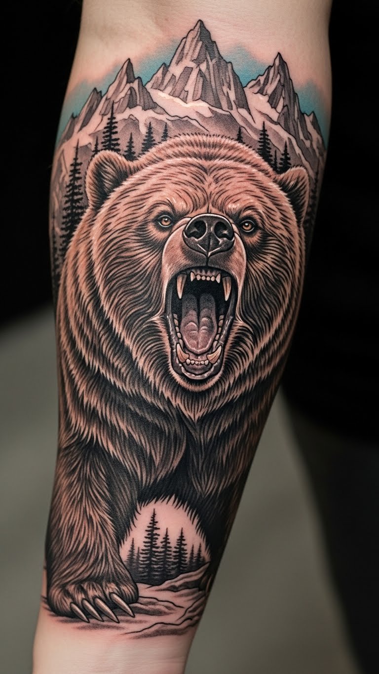This tattoo symbolizes strength, resilience, and a deep connection to nature, embodying the spirit of the grizzly bear.