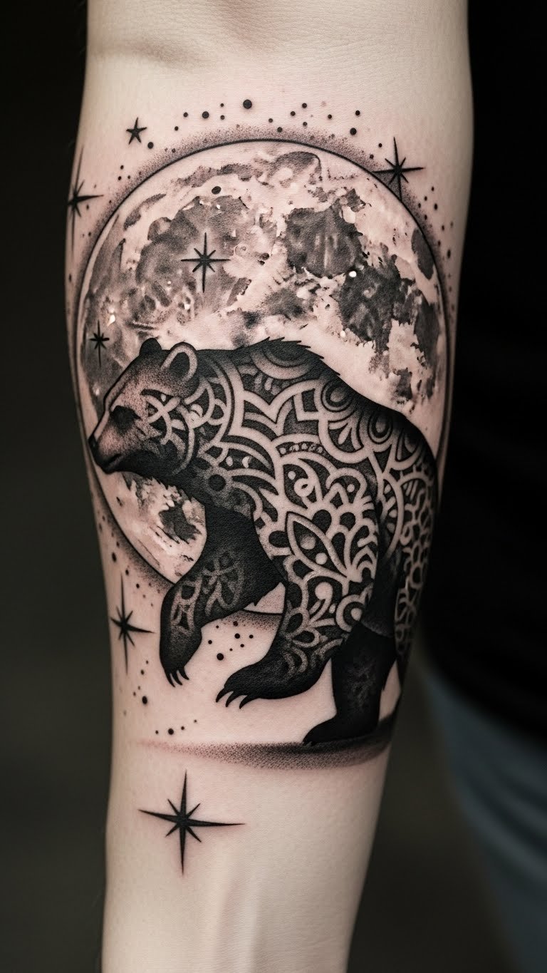 The bear and moon tattoo represents the balance between strength and intuition, making it a powerful symbol for those who embrace nature’s wisdom.