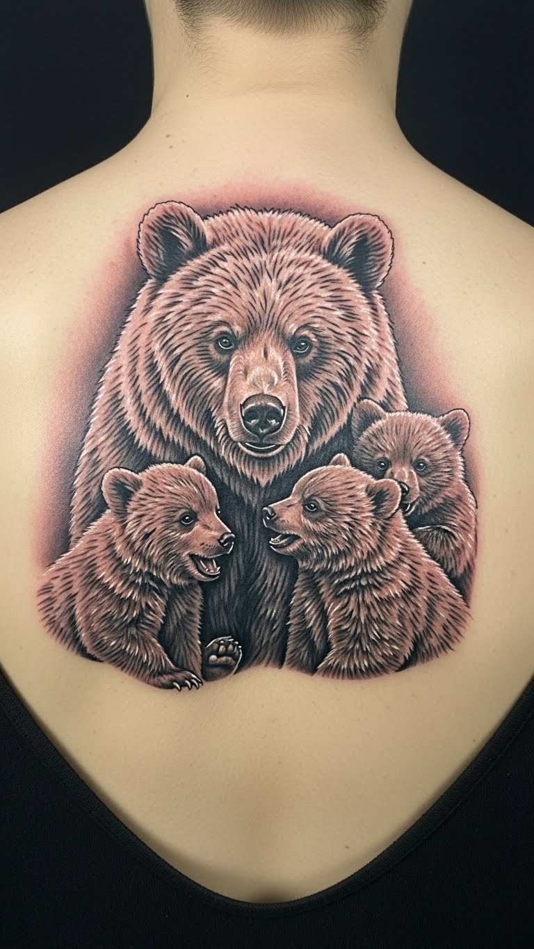 This family-themed bear tattoo symbolizes nurturing bonds and maternal strength, beautifully displayed on the upper back where it can be showcased or concealed as desired.