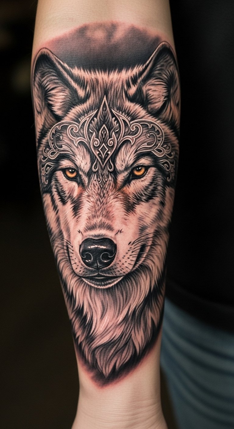This bold forearm tattoo represents strength, loyalty, and resilience, embodying the essence of the wolf as a powerful symbol of guardianship. The geometric patterns enhance the design, reflecting balance and harmony in life. Positioned prominently on the forearm, this tattoo serves as a daily reminder of one’s inner strength and the importance of staying true to oneself, making a striking impression wherever it is seen.