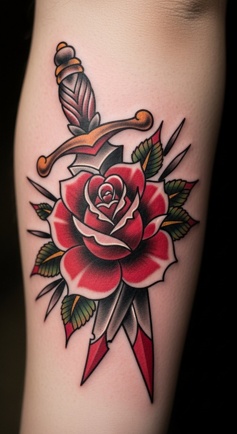 This traditional rose and dagger tattoo symbolizes the duality of love and sacrifice, reflecting the wearer’s journey through struggles and triumphs.