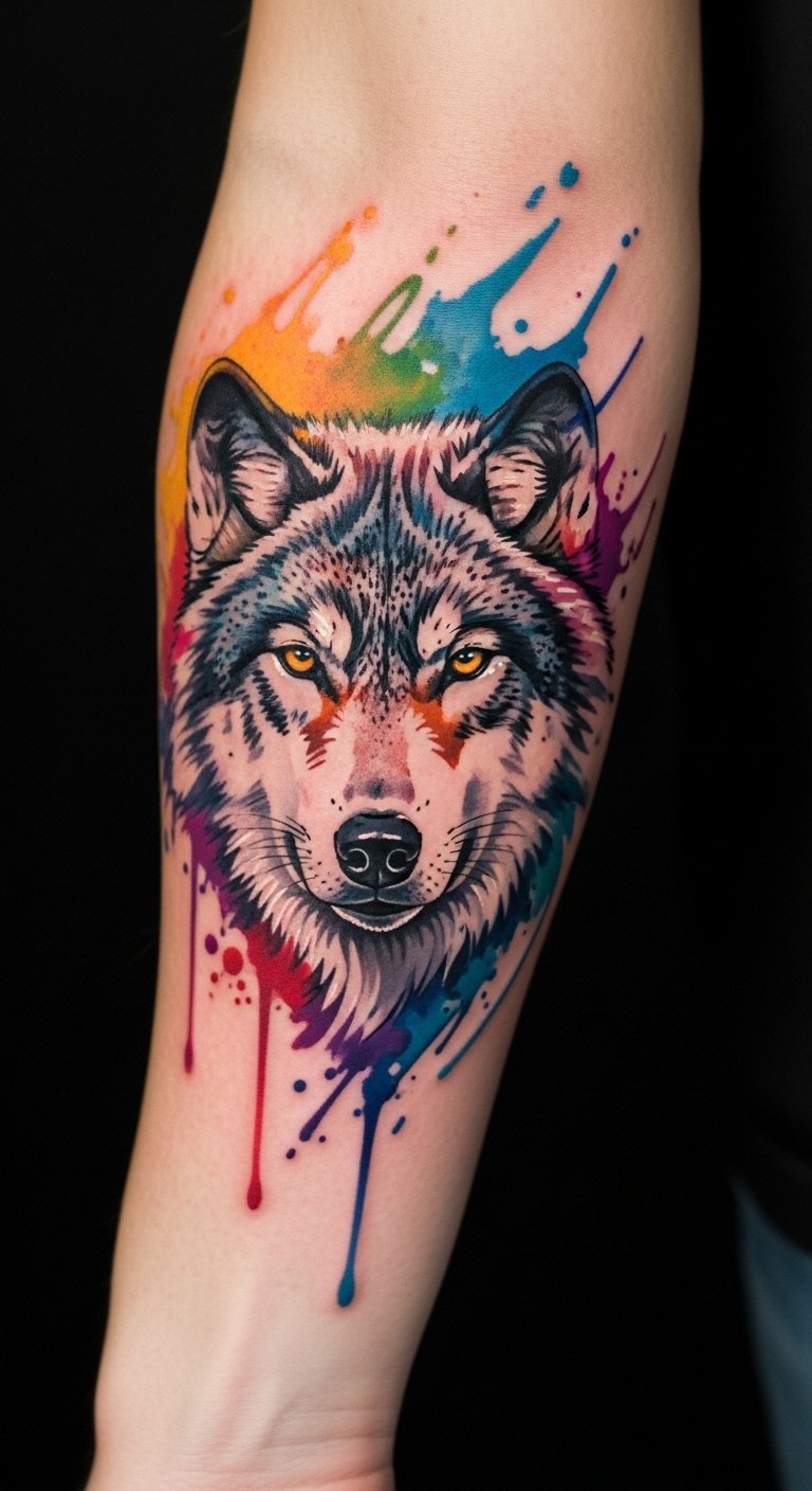 This stunning watercolor wolf tattoo embodies the spirit of adventure and loyalty, making it a powerful symbol for those who embrace their untamed nature.