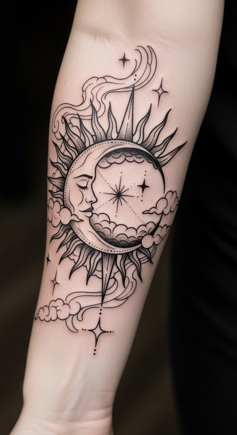 The sun and moon tattoo on the forearm symbolizes the balance of energy and introspection, reflecting the duality within each individual’s journey.