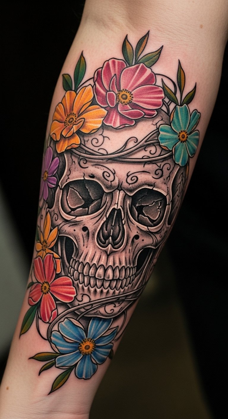 This tattoo embodies the powerful juxtaposition of life and death, beauty and decay. Positioned on the forearm, it serves as a daily reminder of mortality and rebellion, allowing the wearer to express their acceptance of life’s transience.
