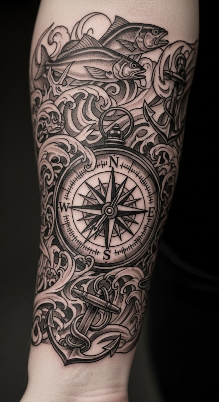 This compass tattoo symbolizes guidance, adventure, and the perpetual quest for freedom.