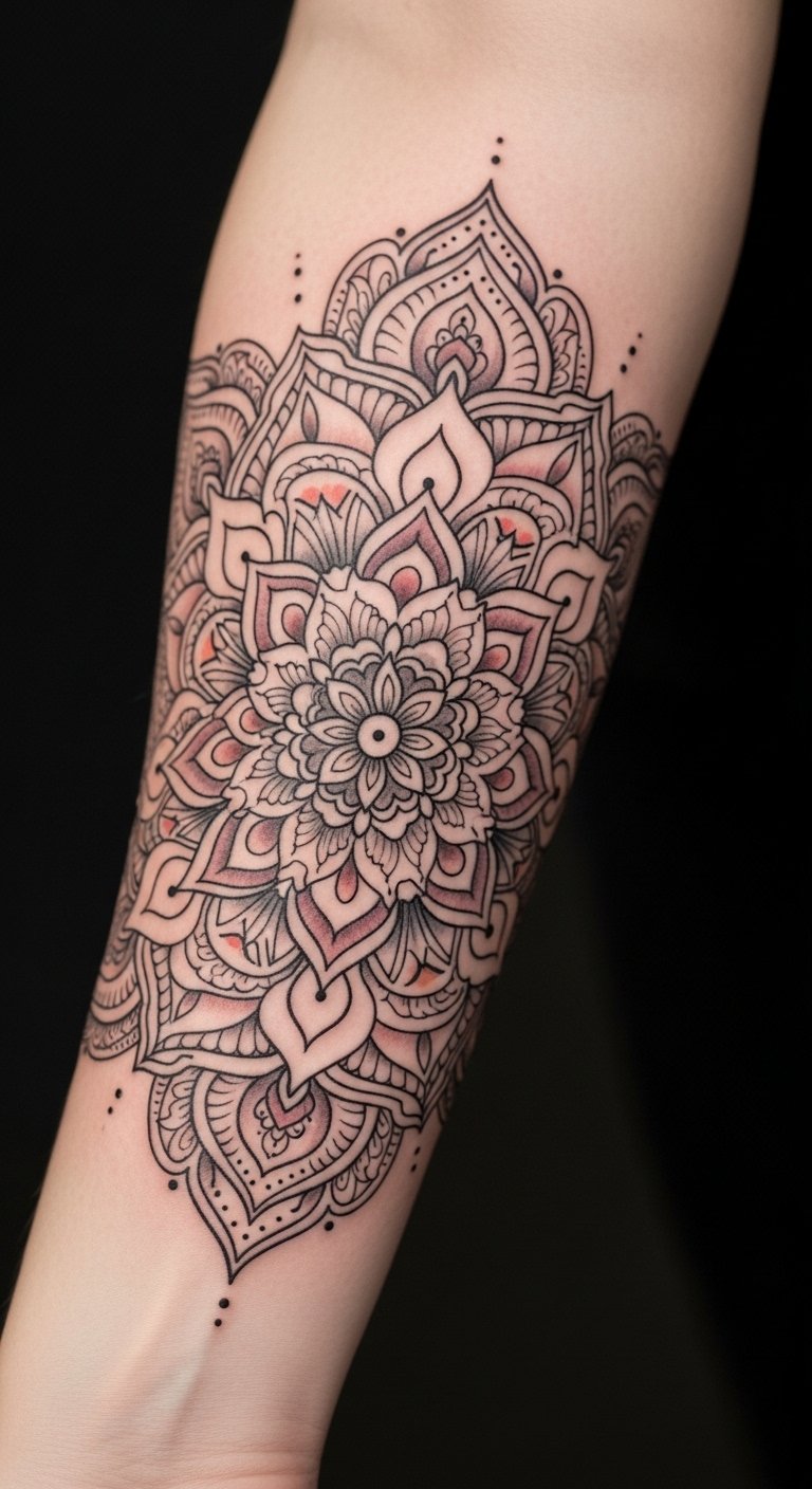 This mandala tattoo on the forearm symbolizes unity and harmony, embodying a journey of personal expression.