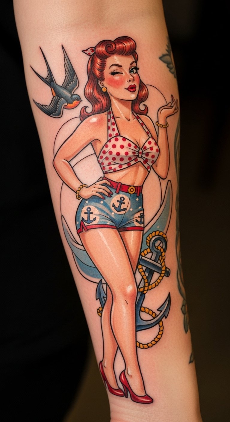 This vintage pin-up girl tattoo embodies the spirit of nostalgia and femininity, making a bold statement on the forearm.