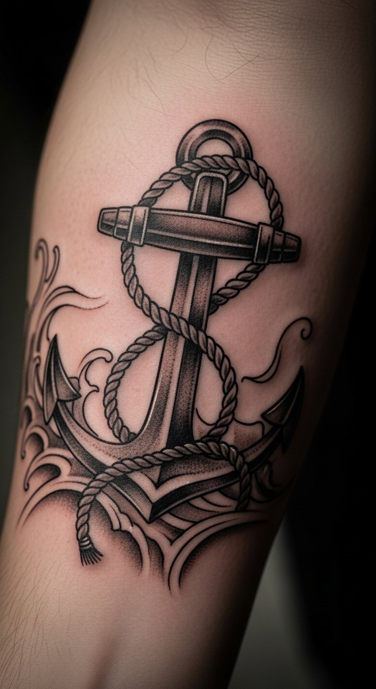 The bold anchor tattoo symbolizes stability and strength, resonating with those who value resilience.