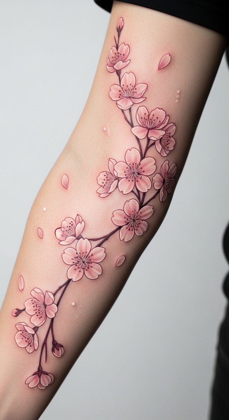 Cherry blossoms symbolize renewal and hope, making them a profound choice for a tattoo. Inked on the forearm, this elegant design serves as a daily reminder to embrace the beauty of life’s transient moments.