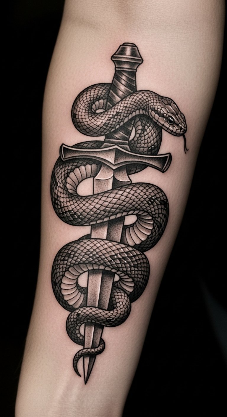 This tattoo design embodies the profound symbolism of transformation and resilience. The snake represents rebirth and cunning, while the dagger signifies courage and protection.
