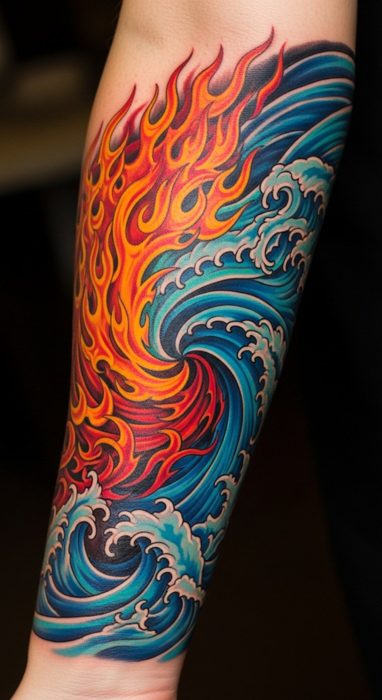 The dynamic interplay of fire and water symbolizes the duality of life experiences, inspiring freedom and individuality while honoring personal meaning and cultural significance.