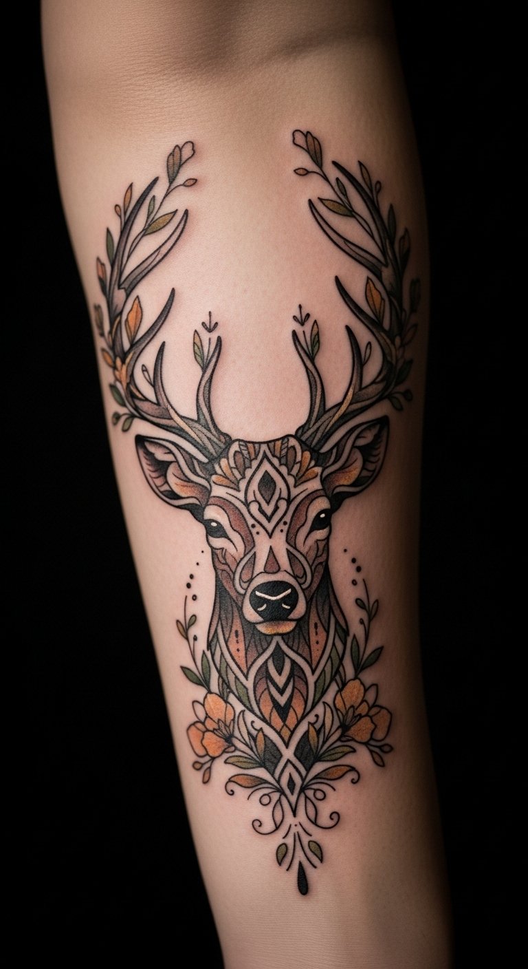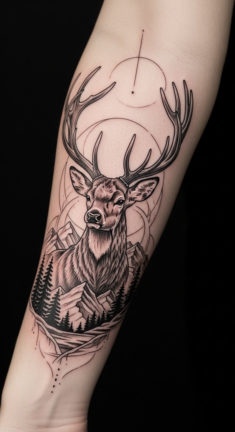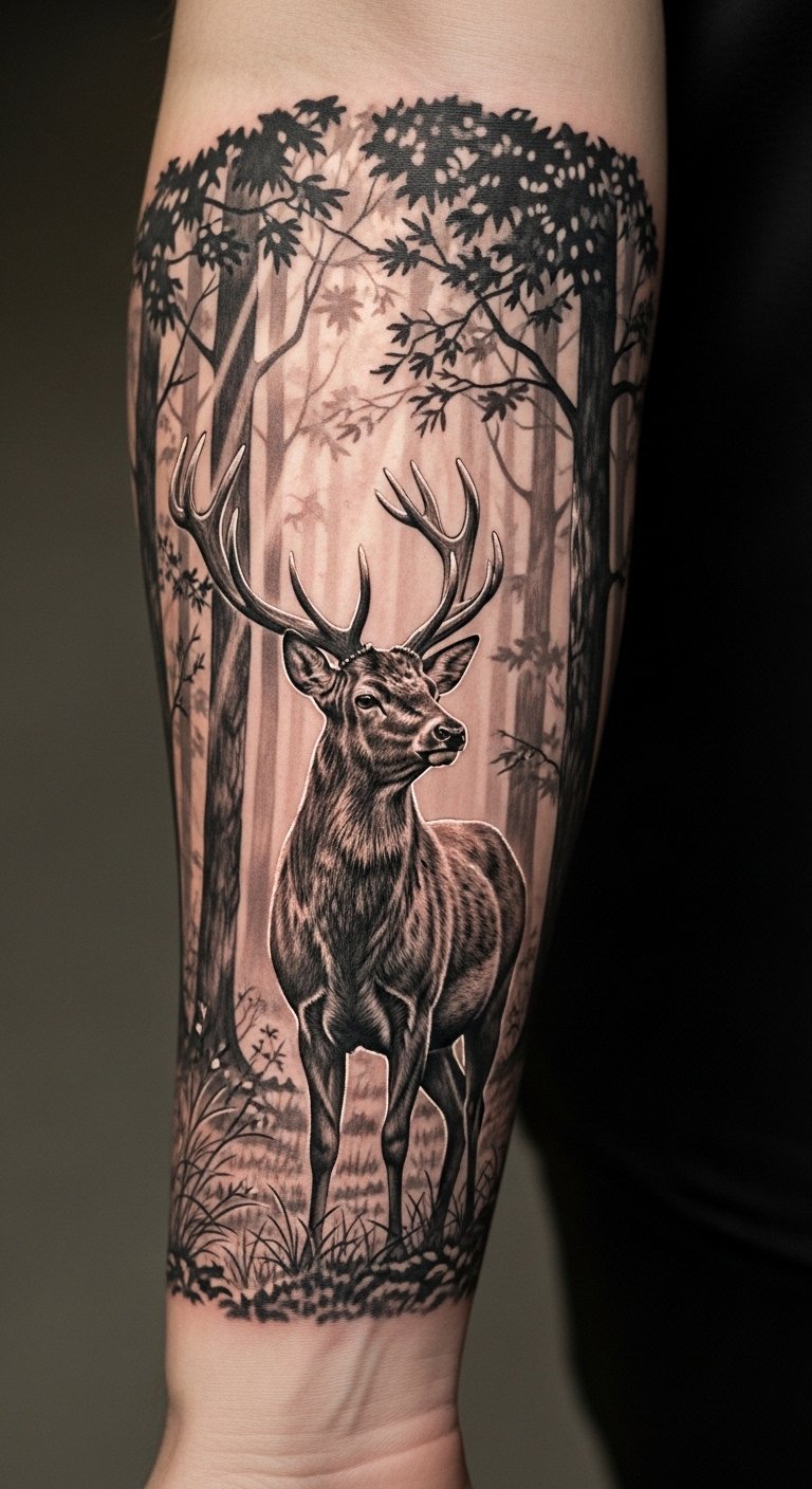 Positioned on the forearm, it serves as a constant reminder of the connection between the hunter and the wilderness. The majestic deer represents strength, grace, and the thrill of the hunt, evoking emotions of pride and reverence for the natural world.