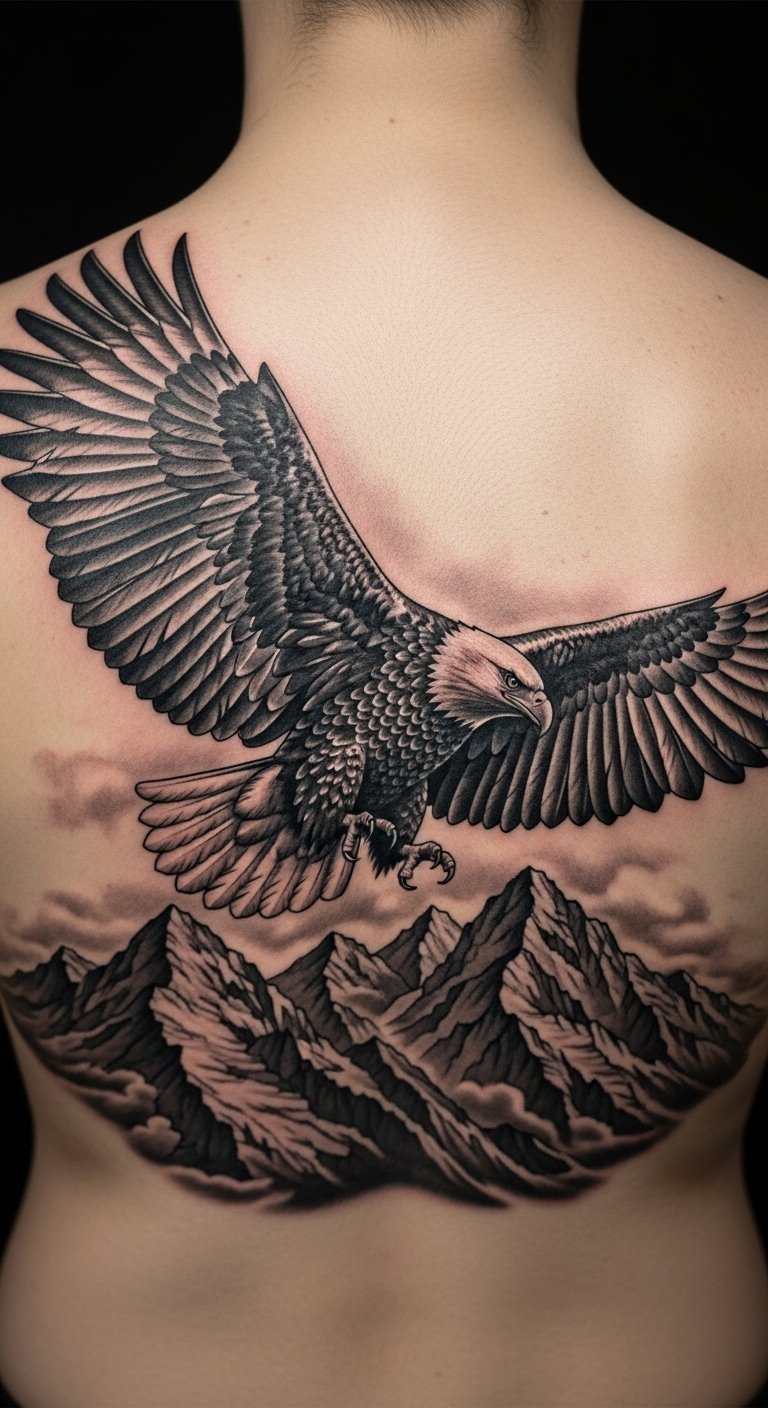 The combination of the eagle and mountain peaks reflects resilience and the untamed beauty of the world, making it a meaningful expression of personal growth and exploration.
