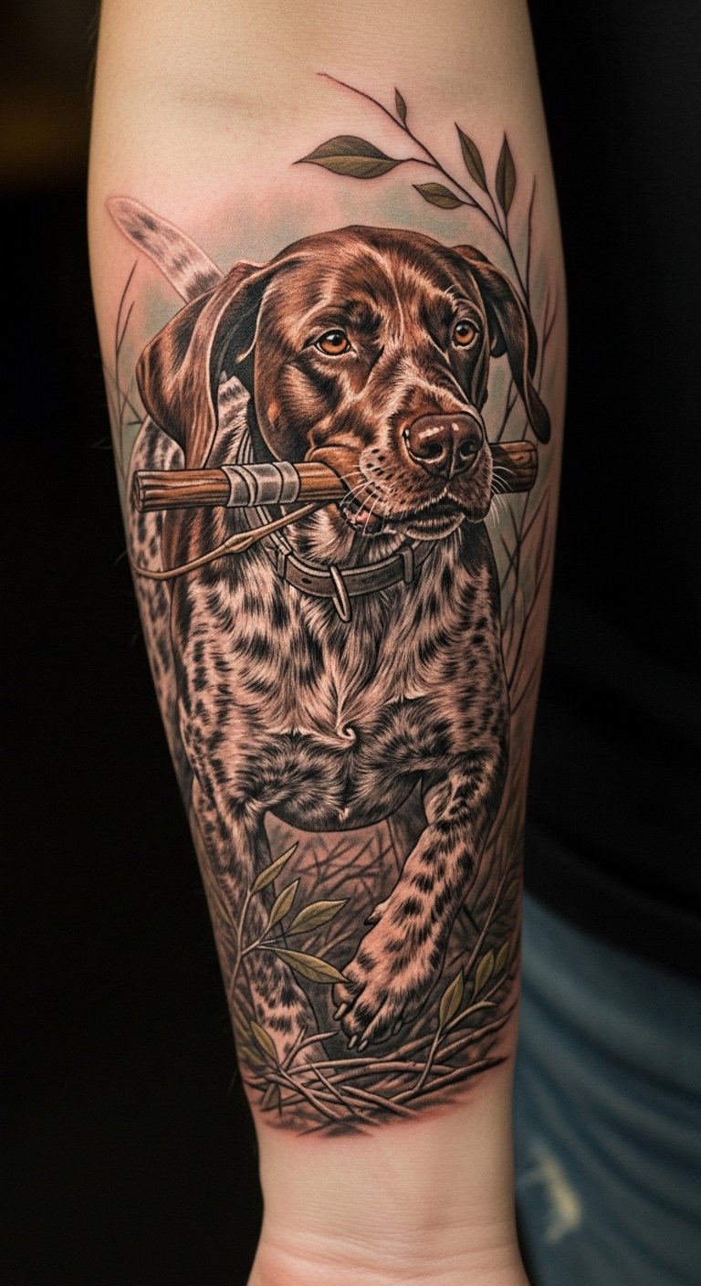 This tattoo design symbolizes loyalty and companionship, reflecting the unwavering bond between a hunter and their loyal dog.