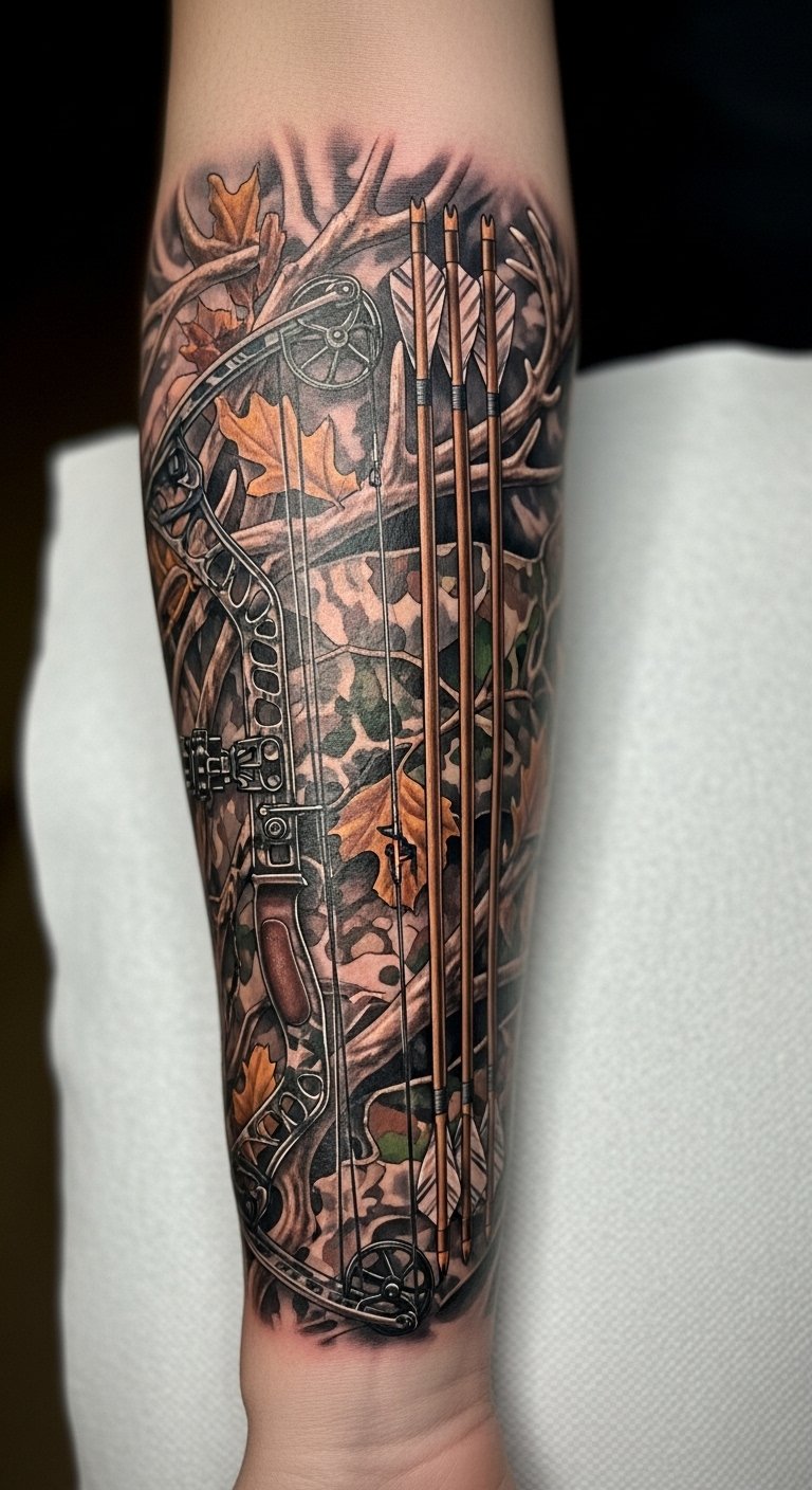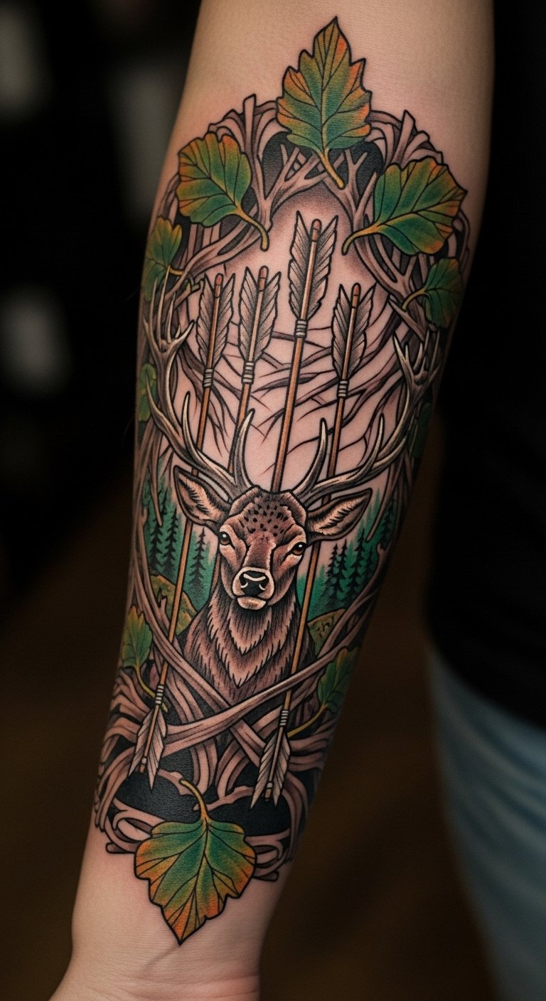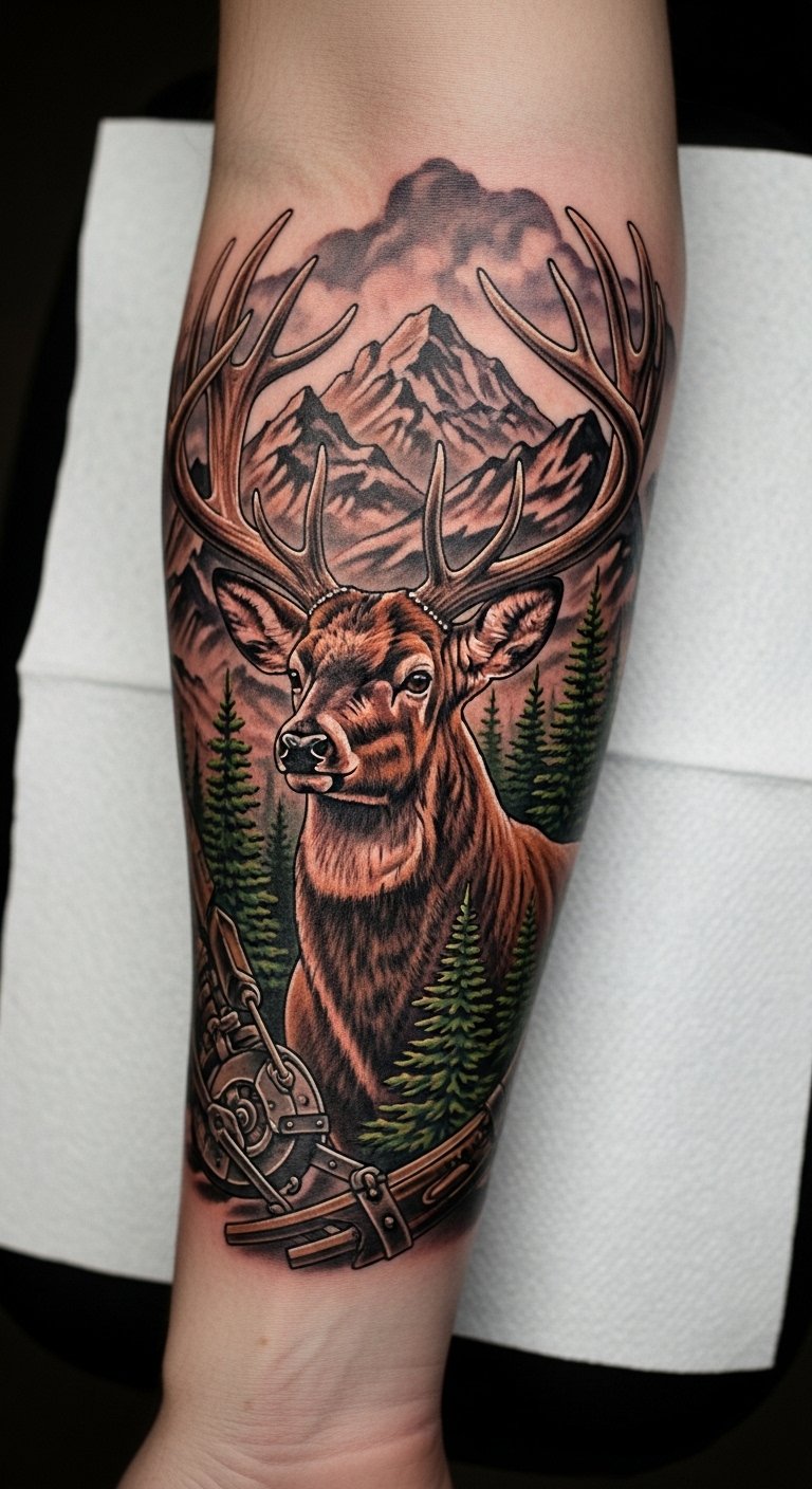 This tattoo symbolizes a deep connection to nature and the outdoors, reflecting the wearer’s passion for hunting and adventure.