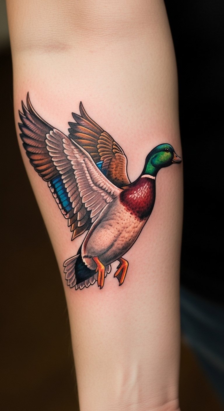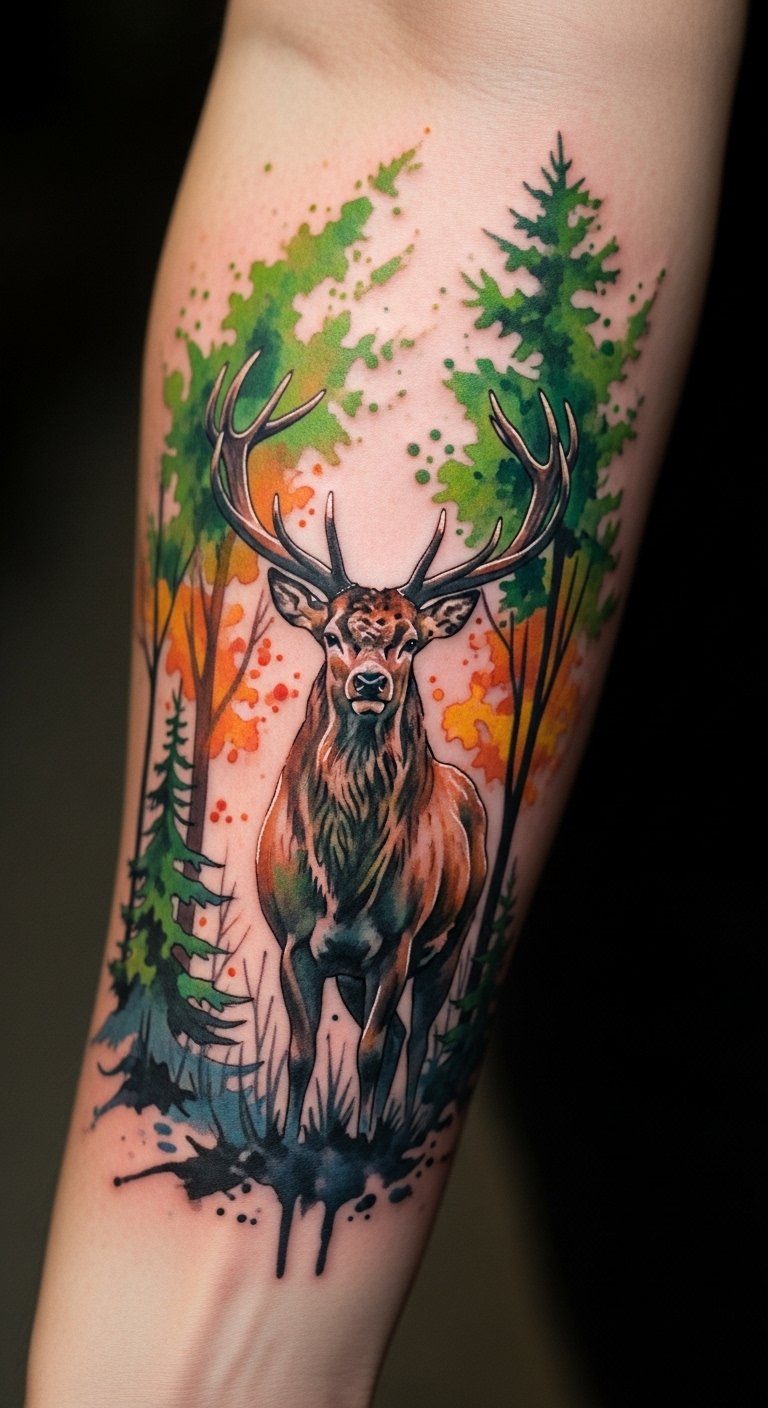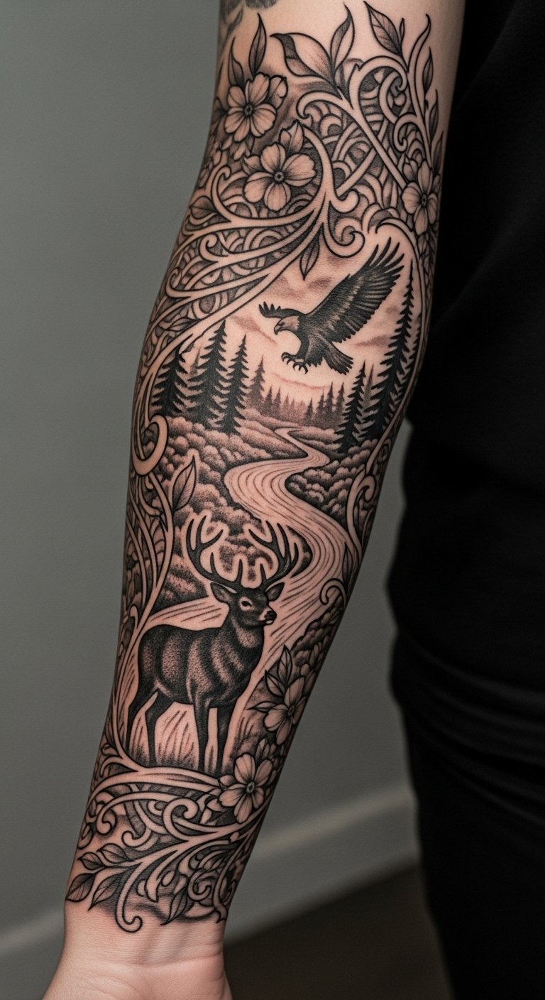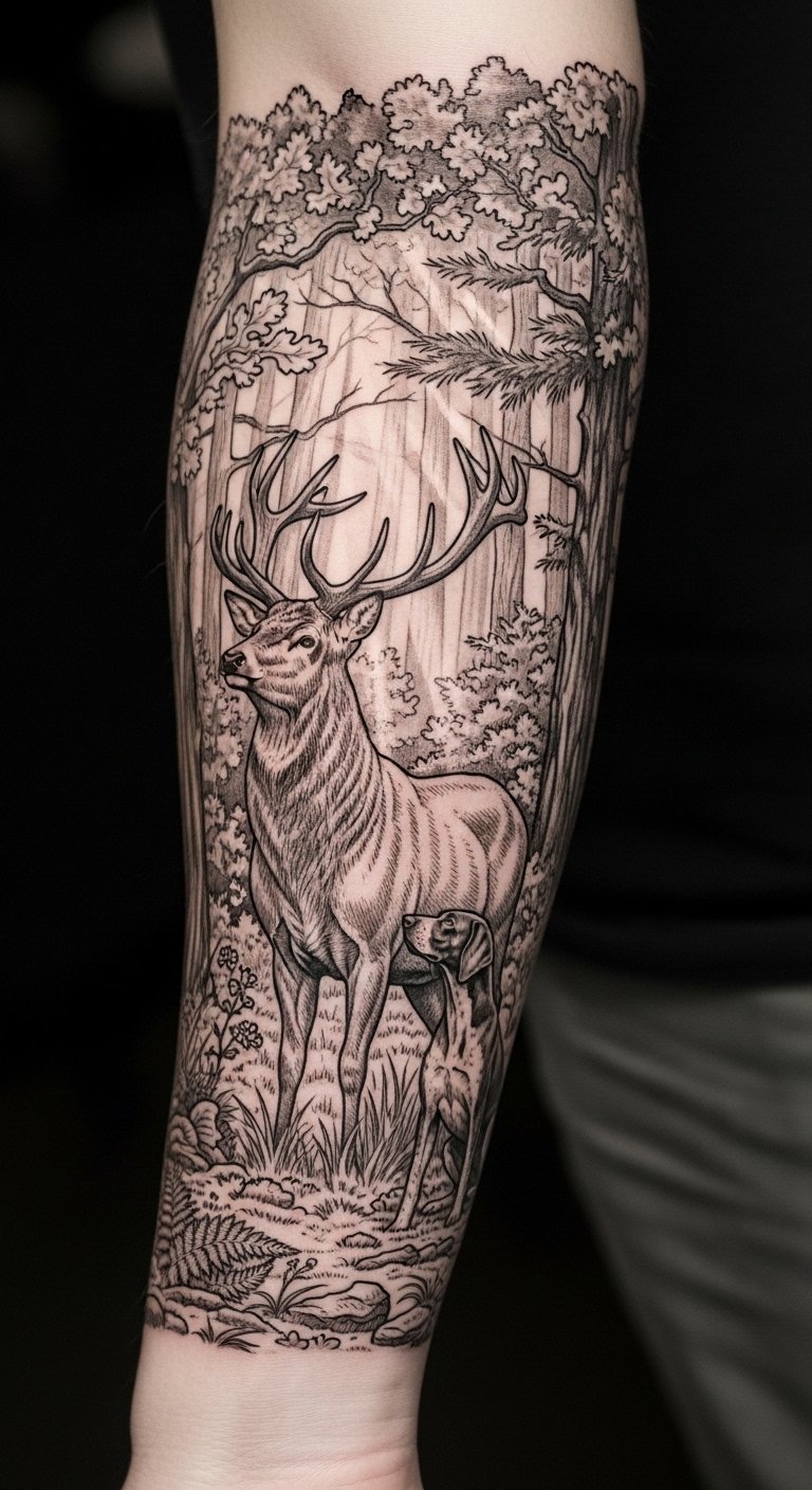 This tattoo symbolizes a deep connection to nature and the outdoors, reflecting the wearer’s passion for hunting and adventure.