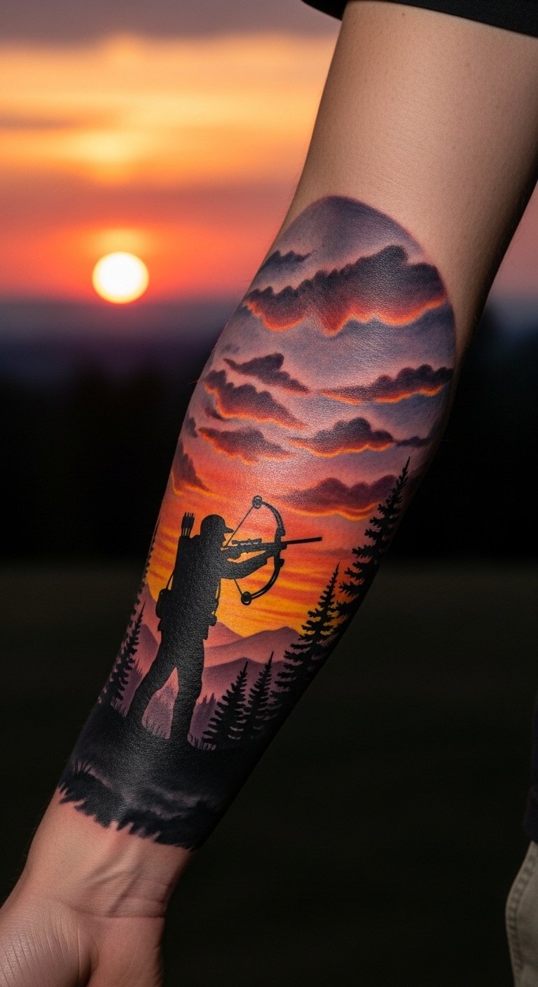 This tattoo symbolizes the deep connection to nature and the adventurous spirit of the hunter.