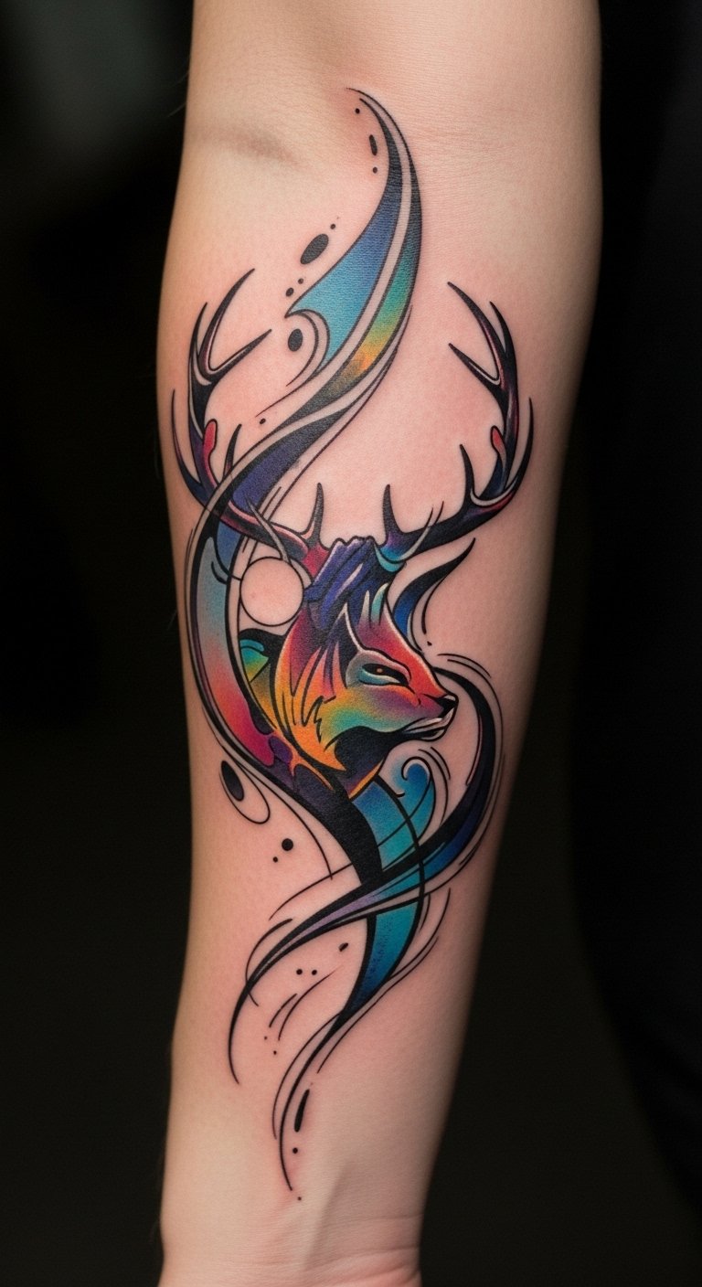 This tattoo embodies the spirit of the hunt, symbolizing freedom and connection to nature through abstract shapes that evoke emotion and individuality.