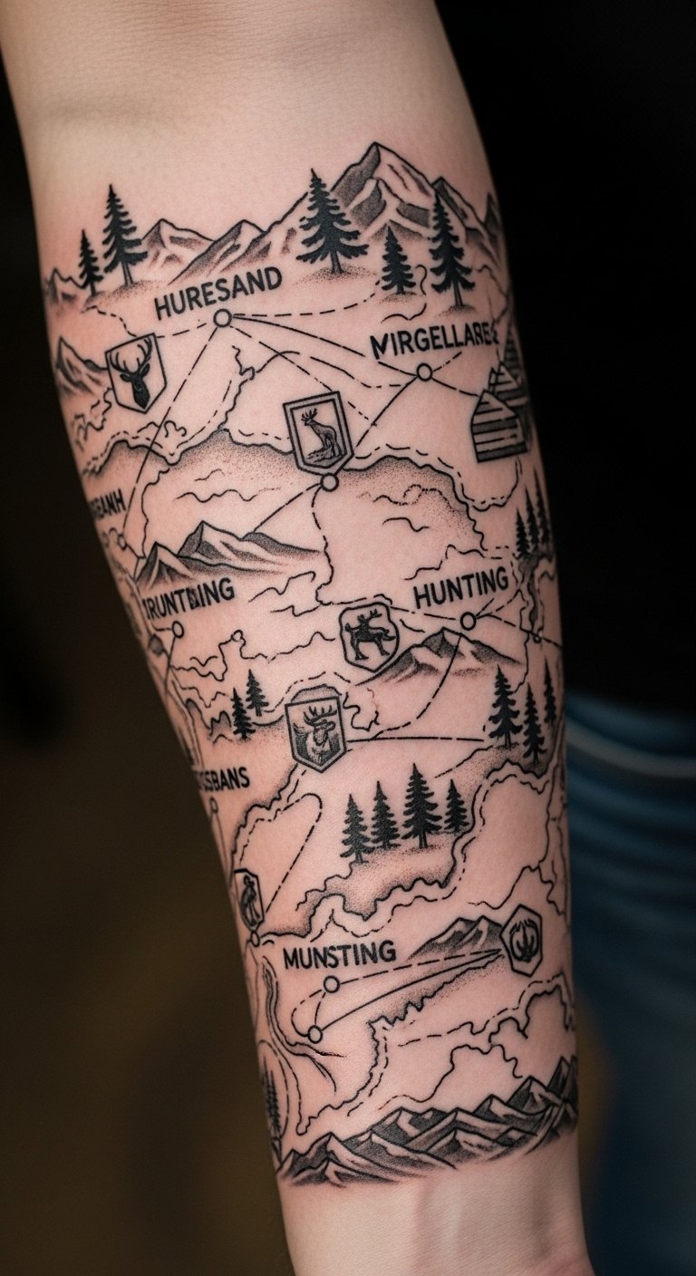This tattoo serves as a tribute to the outdoor adventures and memories made in the wild. Each marked location represents a personal story, symbolizing the joy of camaraderie and the thrill of the hunt.
