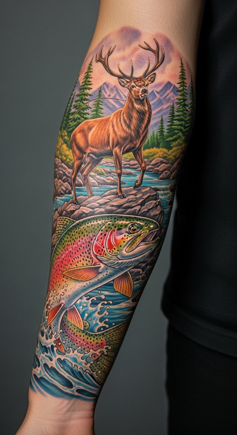 This tattoo captures the essence of adventure and respect for nature, with the trout representing skill in fishing and the stag embodying the spirit of wildlife conservation.