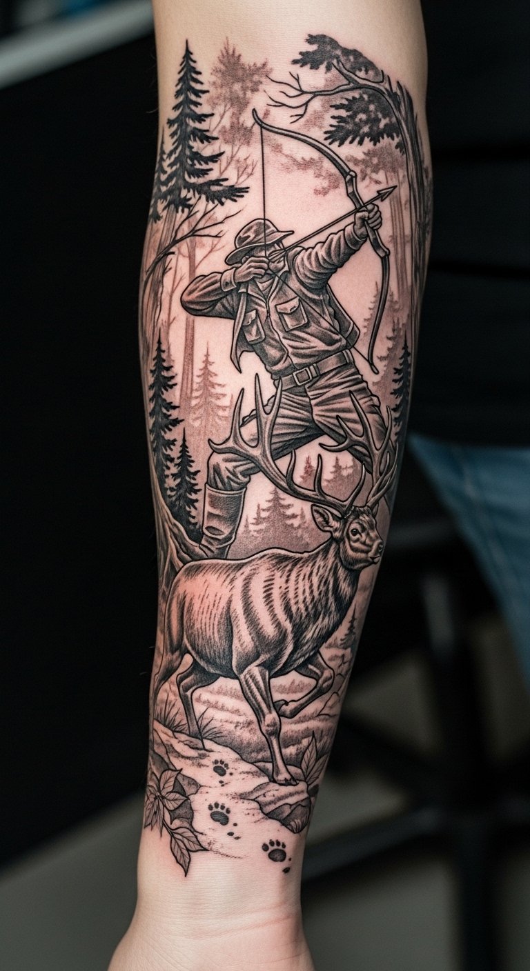 This tattoo design symbolizes the deep connection between the hunter and nature, embodying the thrill and respect inherent in the pursuit.