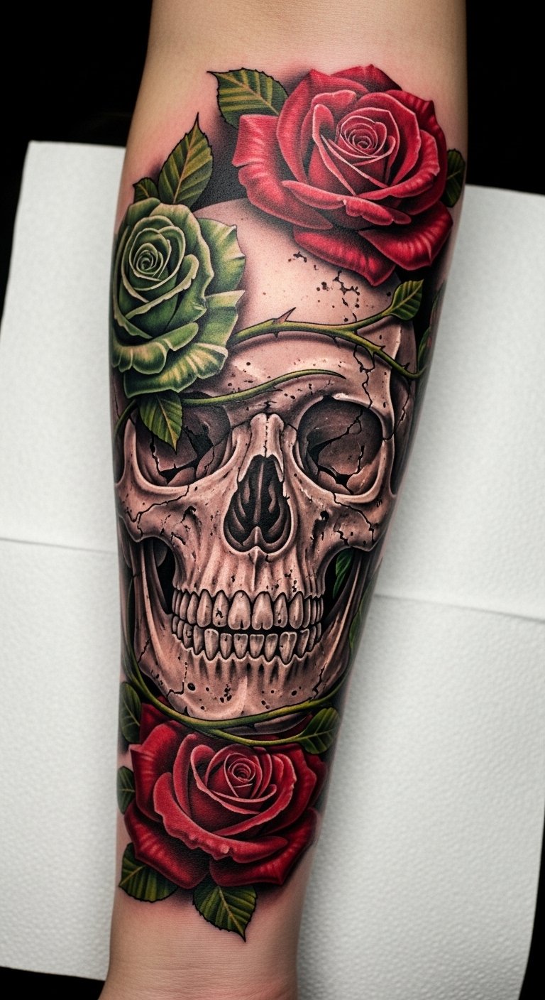 This tattoo design captures the essence of life and death, embodying the delicate balance between mortality and beauty. The skull, with its aged appearance, serves as a reminder of human fragility, while the roses symbolize love and the fleeting nature of beauty.