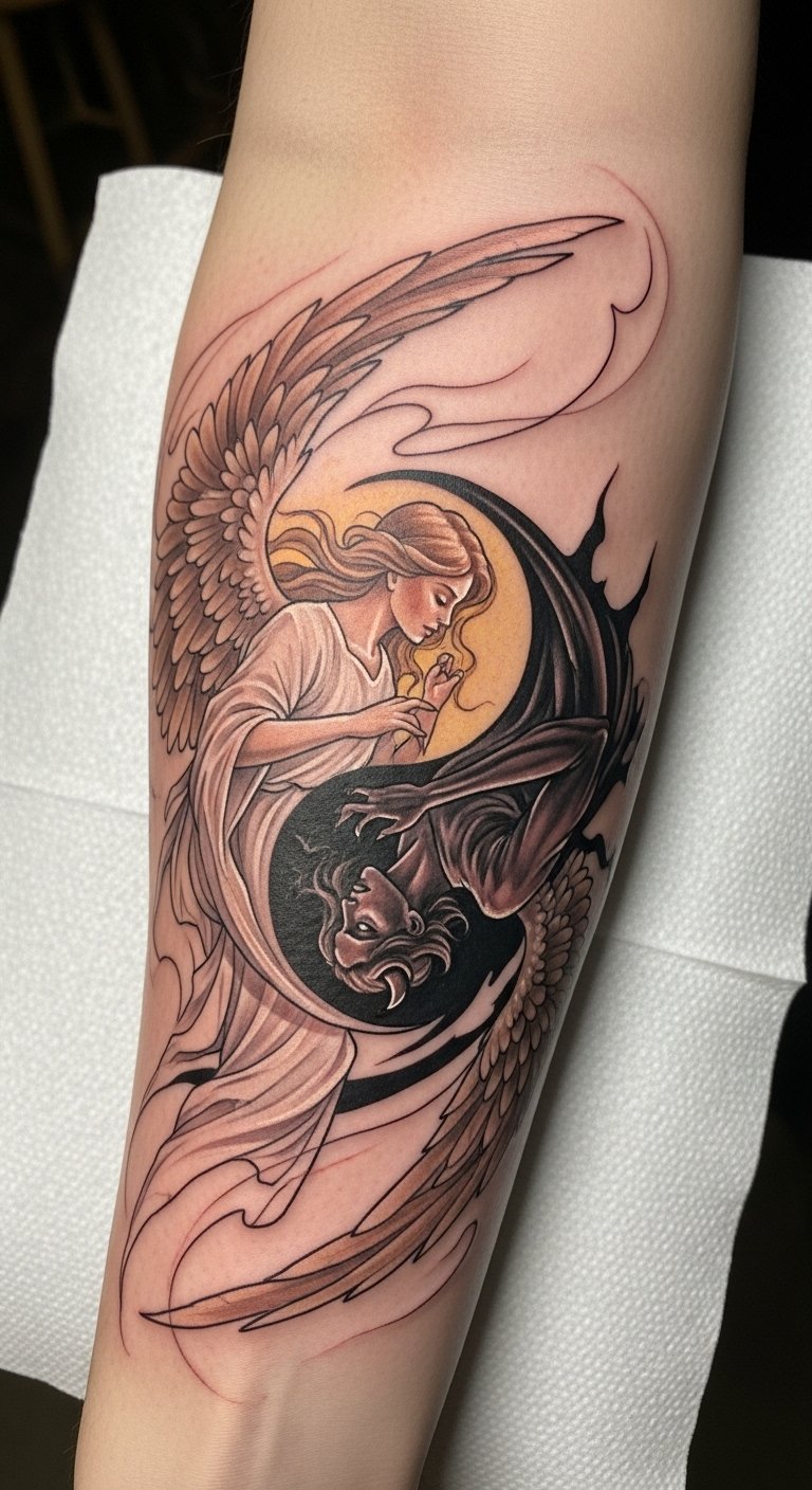 The tattoo symbolizes the eternal tug-of-war between good and evil that exists within every individual.