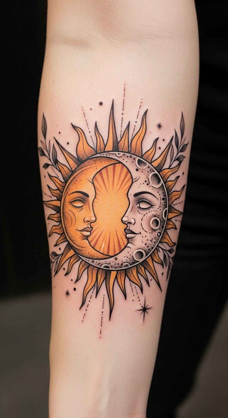 Positioned on the forearm, it serves as a daily reminder of the interplay between the sun and moon, reflecting personal growth and spiritual harmony.