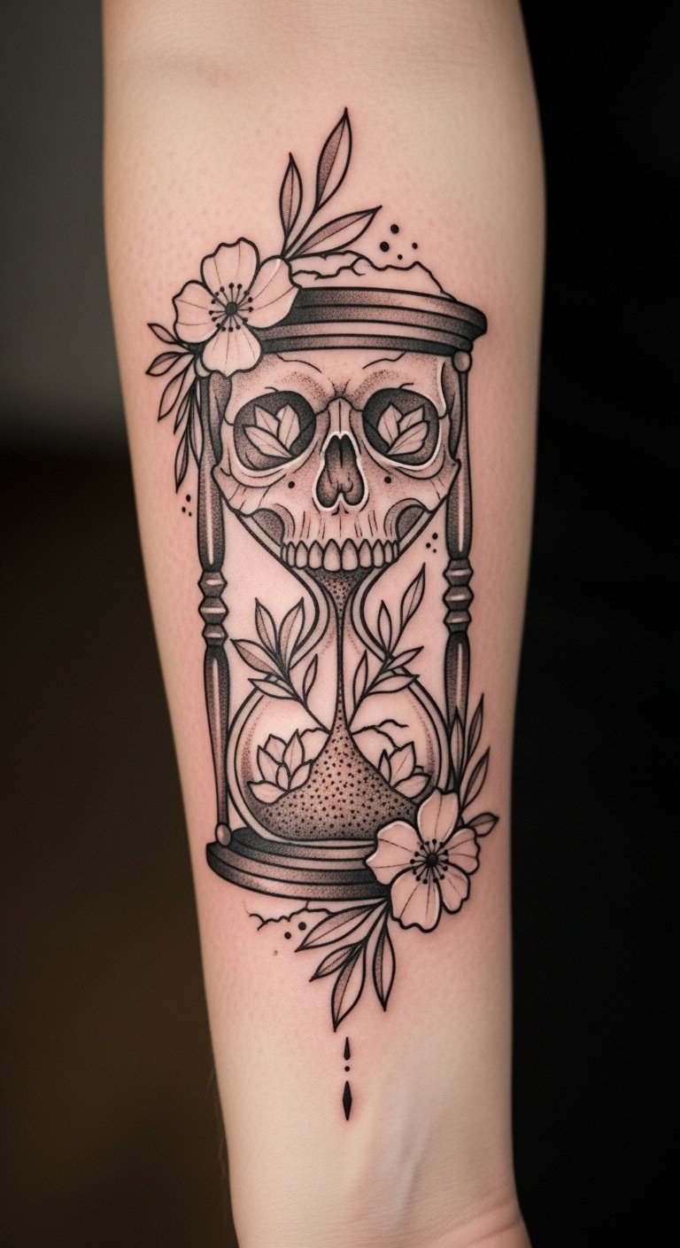 Placed on the forearm, this design allows for visibility and engagement, encouraging introspection and conversation. The floral elements add a touch of beauty, celebrating life’s impermanence and the importance of cherishing each moment.